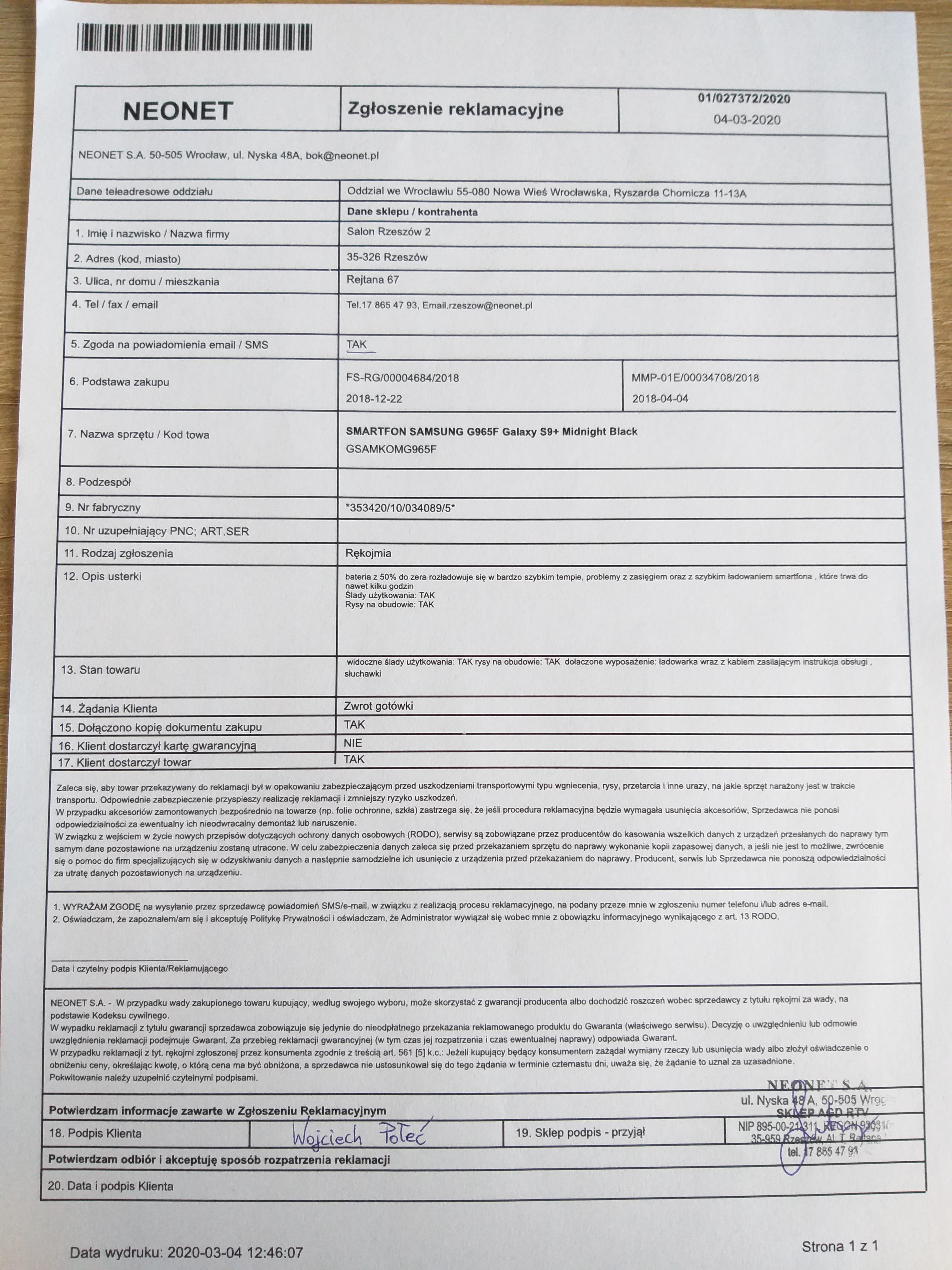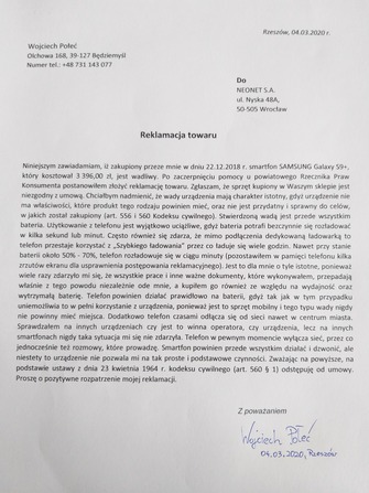 Podczas rozmowy telefonicznej z dnia 18.03.2020 uzyskałem odpowiedź, że termin rozpatrzenia reklamacji trwa 30 dni i postarają się jak najszybciej to rozpatrzyć. Zaznaczyli w systemie moją interwencję. W sklepie stacjonarnym przy składaniu reklamacji zostałem zbywany, że nie mogę tam złożyć reklamacji z tytułu rękojmi lecz w autoryzowanym serwisie producenta lub złożyć reklamację z tytułu gwarancji. Zostałem przy swoim i złożyłem na miejscu w sklepie stacjonarnym. Moje uwagi są takie, że z telefonu praktycznie nie da się korzystać, gdyż niespodziewanie nawet przy 50% baterii rozładowuje się w kilka sekund ewentualnie w ciągu kilku minut bez używania go. Połączenia z innymi osobami są często rozłączane poprzez wyłączanie przez smartfona sieci nawet w centrum miasta przy pełnym zasięgu (byłem u operatora i sprawdzałem na innych urządzeniach i przyczyna nie jest znana, a na innych urządzeniach działa bez zarzutu). Korzystanie z urządzenia jest praktycznie niemożliwe.