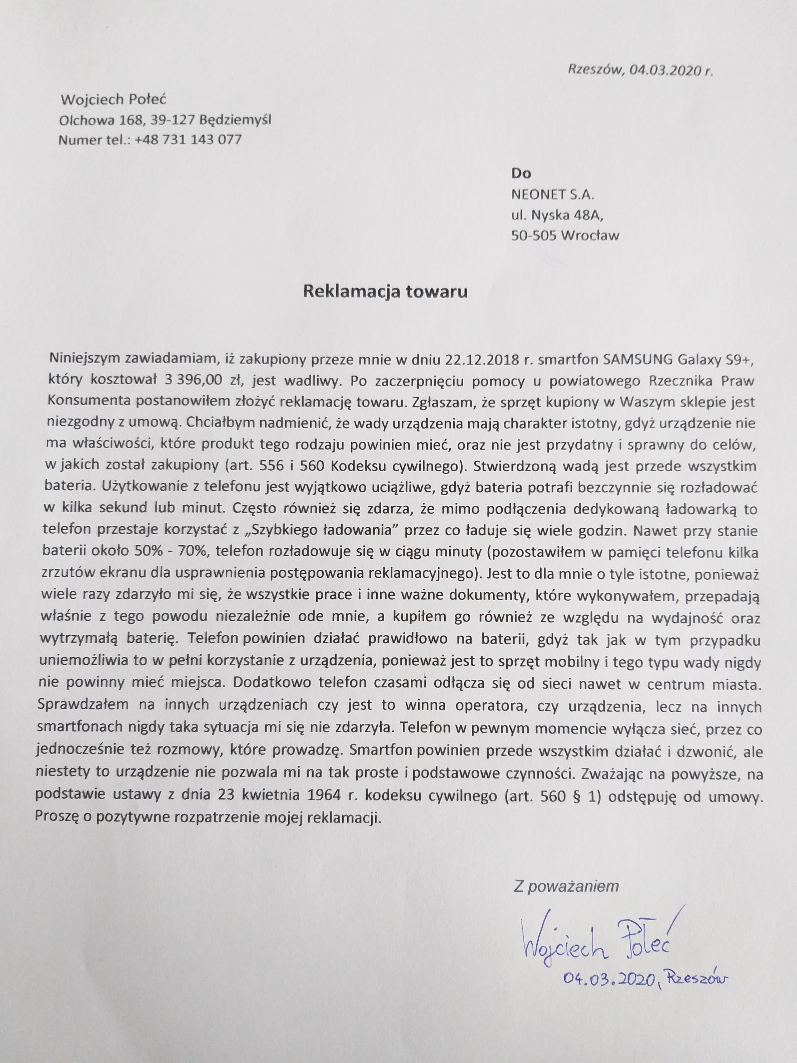 Niniejszym zawiadamiam, iż zakupiony przeze mnie w dniu 22.12.2018 r. smartfon SAMSUNG Galaxy S9+, który kosztował 3396,00 zł, jest wadliwy. Po zaczerpnięciu pomocy u powiatowego Rzecznika Praw Konsumenta postanowiłem złożyć reklamację towaru. Zgłaszam, że sprzęt kupiony w Waszym sklepie jest niezgodny z umową. Chciałbym nadmienić, że wady urządzenia mają charakter istotny, gdyż urządzenie nie ma właściwości, które produkt tego rodzaju powinien mieć, oraz nie jest przydatny i sprawny do celów, w jakich został zakupiony (art. 556 i 560 Kodeksu cywilnego). Stwierdzoną wadą jest przede wszystkim bateria. Użytkowanie z telefonu jest wyjątkowo uciążliwe, gdyż bateria potrafi bezczynnie się rozładować w kilka sekund lub minut. Często również się zdarza, że mimo podłączenia dedykowaną ładowarką to telefon przestaje korzystać z „Szybkiego ładowania” przez co ładuje się wiele godzin. Nawet przy stanie baterii około 50% - 70%, telefon rozładowuje się w ciągu minuty (pozostawiłem w pamięci telefonu kilka zrzutów ekranu dla usprawnienia postępowania reklamacyjnego). Jest to dla mnie o tyle istotne, ponieważ wiele razy zdarzyło mi się, że wszystkie prace i inne ważne dokumenty, które wykonywałem, przepadają właśnie z tego powodu niezależnie ode mnie, a kupiłem go również ze względu na wydajność oraz wytrzymałą baterię. Telefon powinien działać prawidłowo na baterii, gdyż tak jak w tym przypadku uniemożliwia to w pełni korzystanie z urządzenia, ponieważ jest to sprzęt mobilny i tego typu wady nigdy nie powinny mieć miejsca. Dodatkowo telefon czasami odłącza się od sieci nawet w centrum miasta. Sprawdzałem na innych urządzeniach czy jest to winna operatora, czy urządzenia, lecz na innych smartfonach nigdy taka sytuacja mi się nie zdarzyła. Telefon w pewnym momencie wyłącza sieć, przez co jednocześnie też rozmowy, które prowadzę. Smartfon powinien przede wszystkim działać i dzwonić, ale niestety to urządzenie nie pozwala mi na tak proste i podstawowe czynności. Zważając na powyższe, na podstawie ustawy z dnia 23 kwietnia 1964 r. kodeksu cywilnego (art. 560 § 1) odstępuję od umowy. Proszę o pozytywne rozpatrzenie mojej reklamacji.