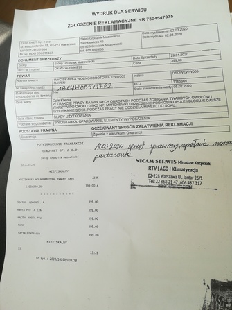 Reklamacja poraz 3 reklamoje urzadzenie, w dalszym ciagu urzadzenie nie pracjue prawidlowo. RozszczelnIenie sokowirowki wczasie jej pracy. DALSZA PRACA NIE MOZLIWA PRZESYLAM ZDIECIA