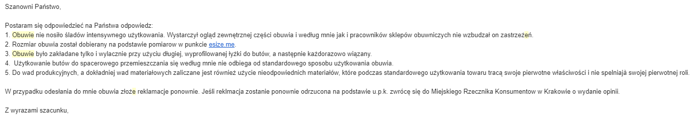 Reklamacja została nieuznana. Otrzymałem informację, że buty posiadają bardzo wyraźne ślady użycia, co według mnie jest prawdą jeśli chodzi o zniszczony środek obuwia, natomiast z zewnątrz buty prezentowały się praktycznie jak nowe. Jako bezpośrednią przyczynę odrzucenia reklamacji podano niewłaściwe dopasowanie buta do rozmiaru stopu, nieużywanie łyżki do butów podczas zakładania oraz nieodpowiednie wiązanie butów. W odpowiedzi wyjaśniłem, że rozmiar obuwia był dobierany na podstawie pomiarów w spółce partnerskiej esize.me, a buty były każdorazowo zakładane z użyciem specjalnej łyżki oraz wiązane. Dzisiaj otrzymałem również informację od ebuwie, że mogę nie przyjąć paczki z butami i zostanie do nich skierowana w ramach odwołania na kolejną weryfikację.