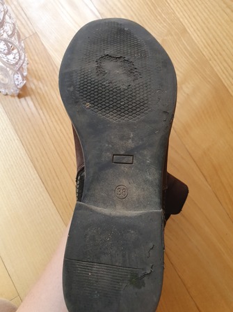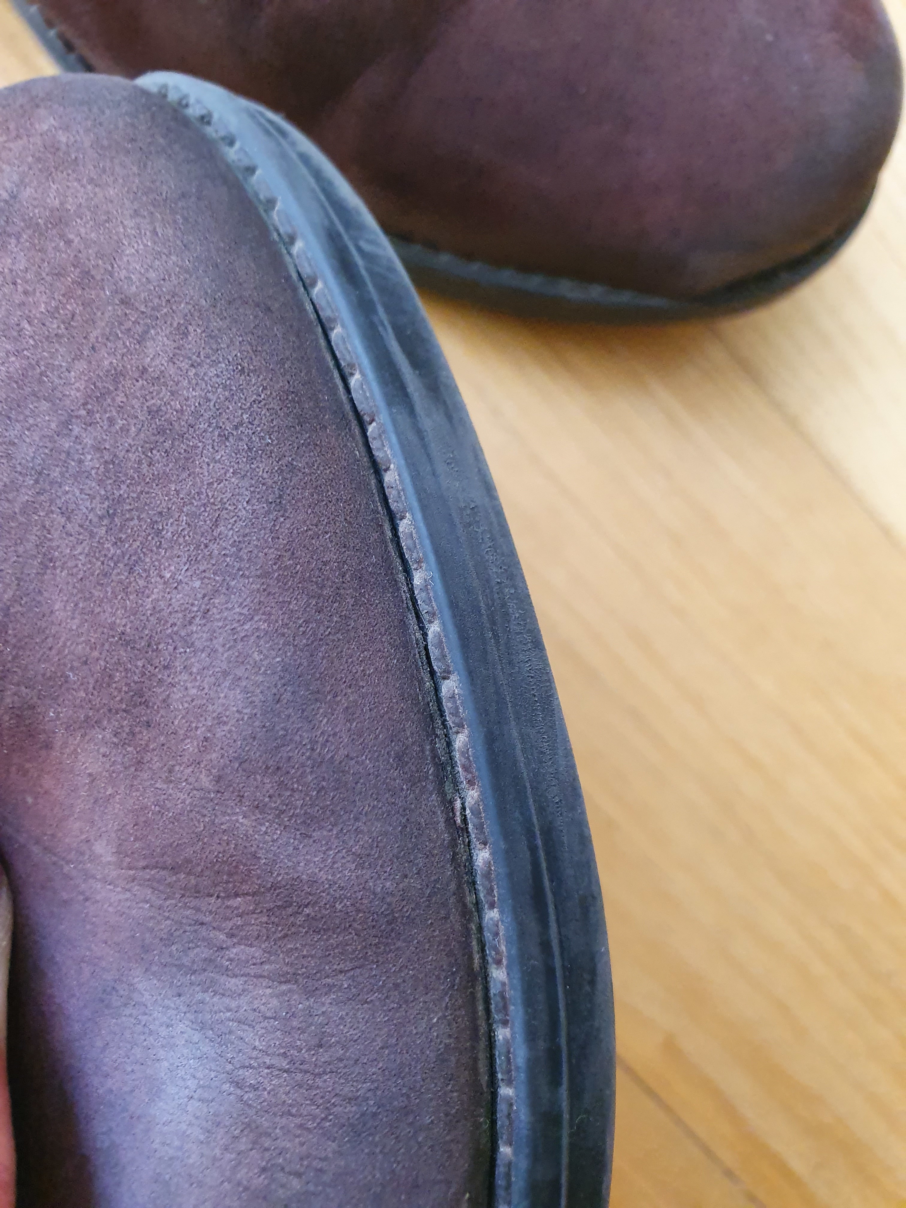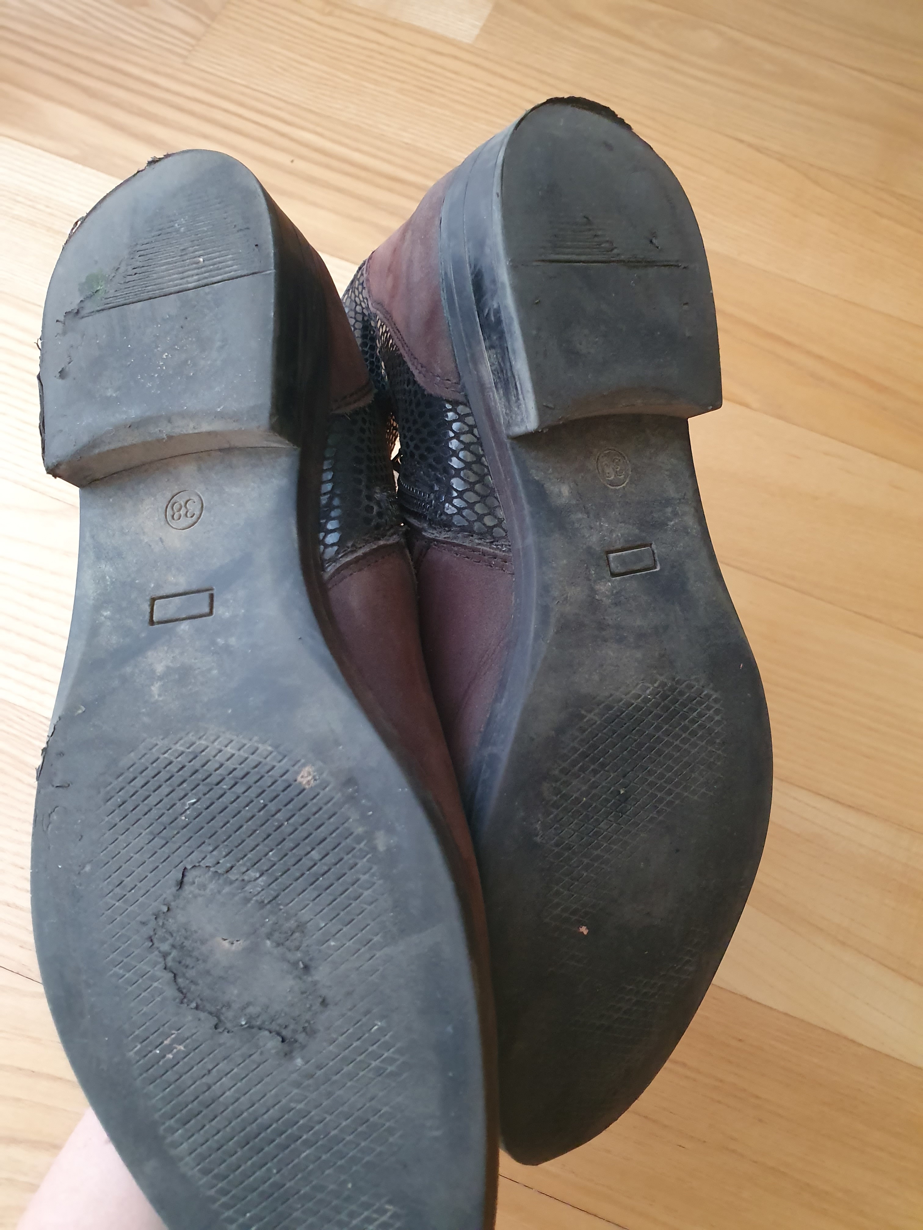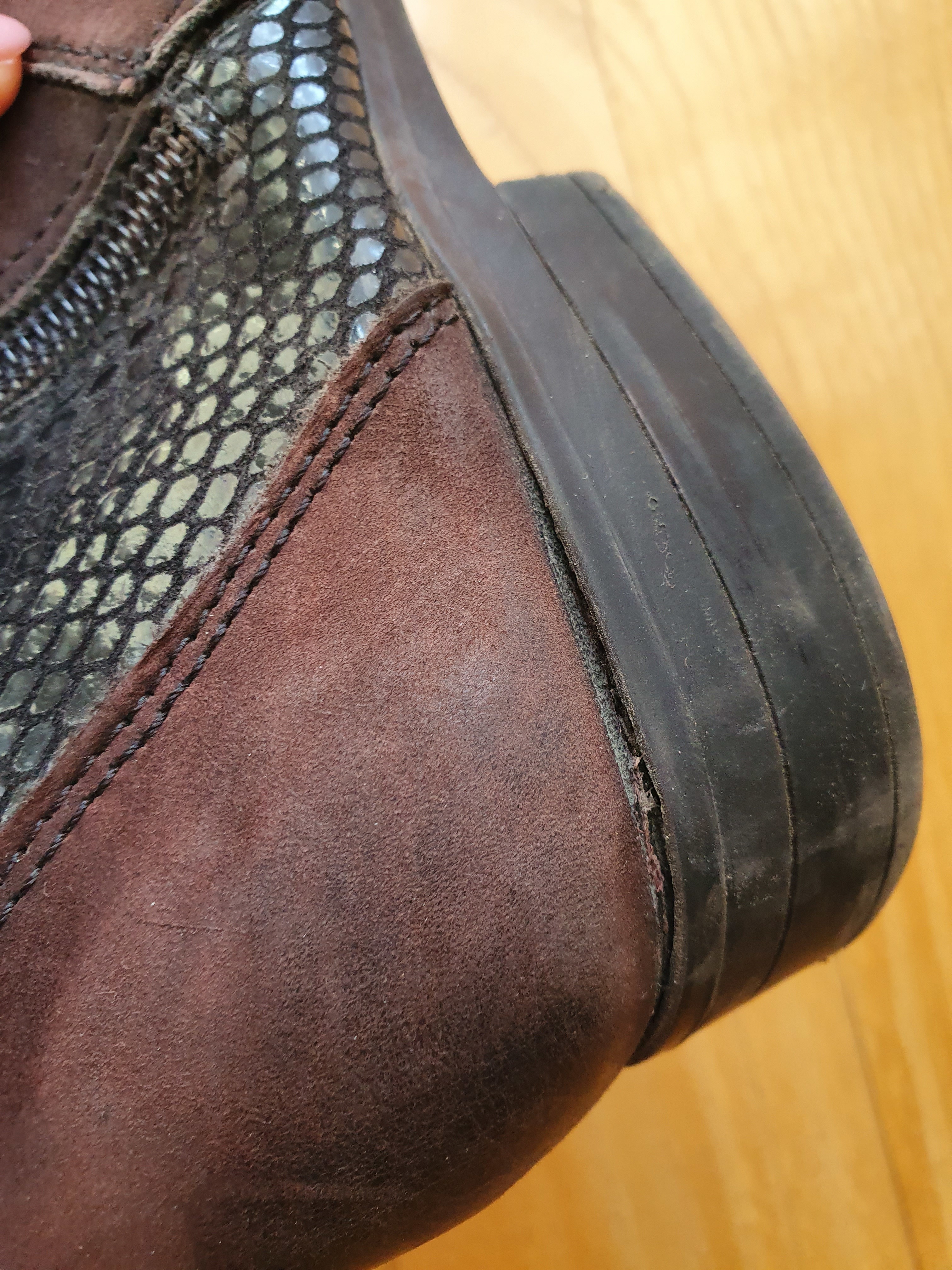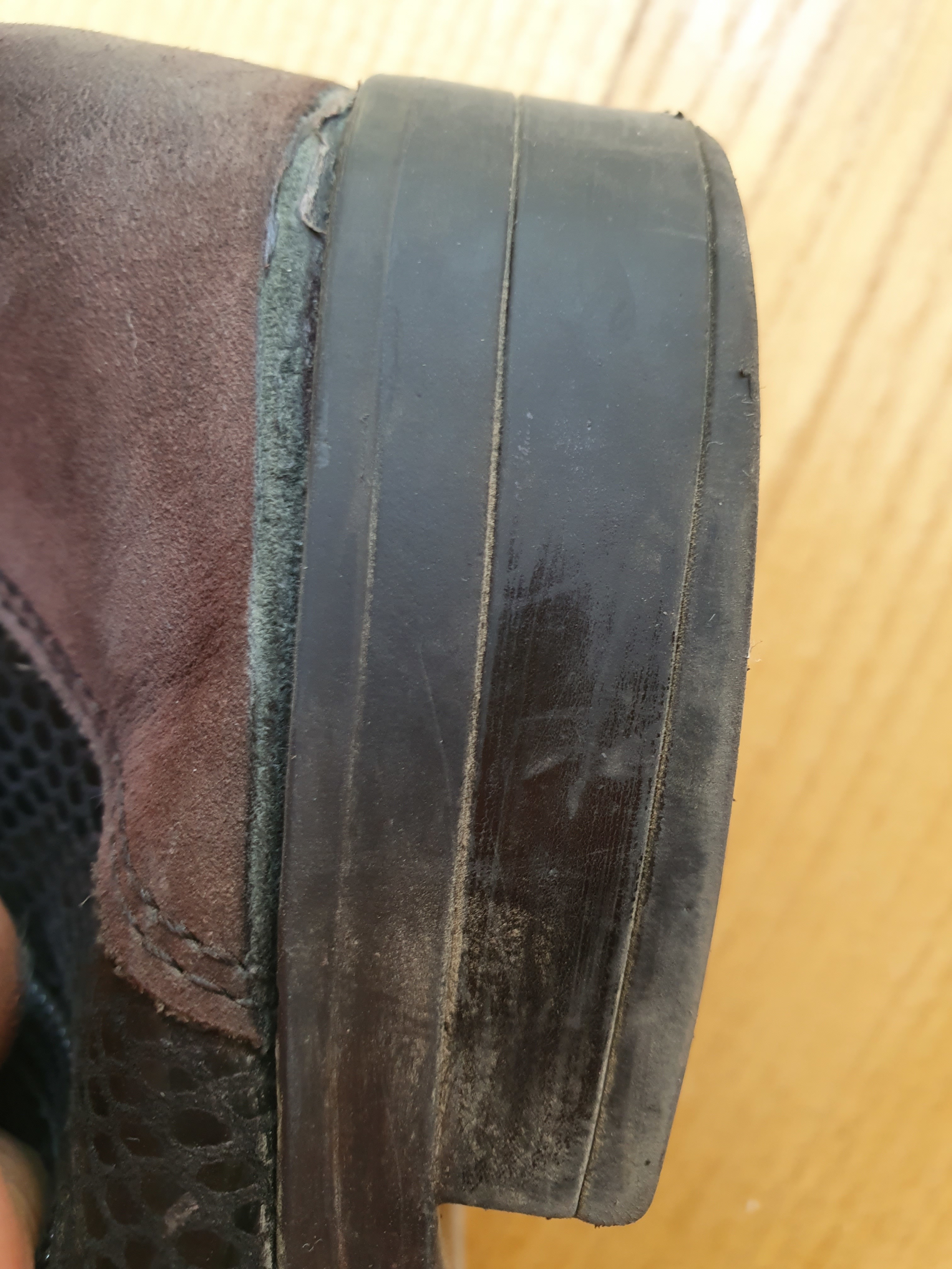 Odklejenie podeszwy dookoła butów. zdarcie podeszwy w lewym bucie, rozciągnięcie gumy w prawym bucie