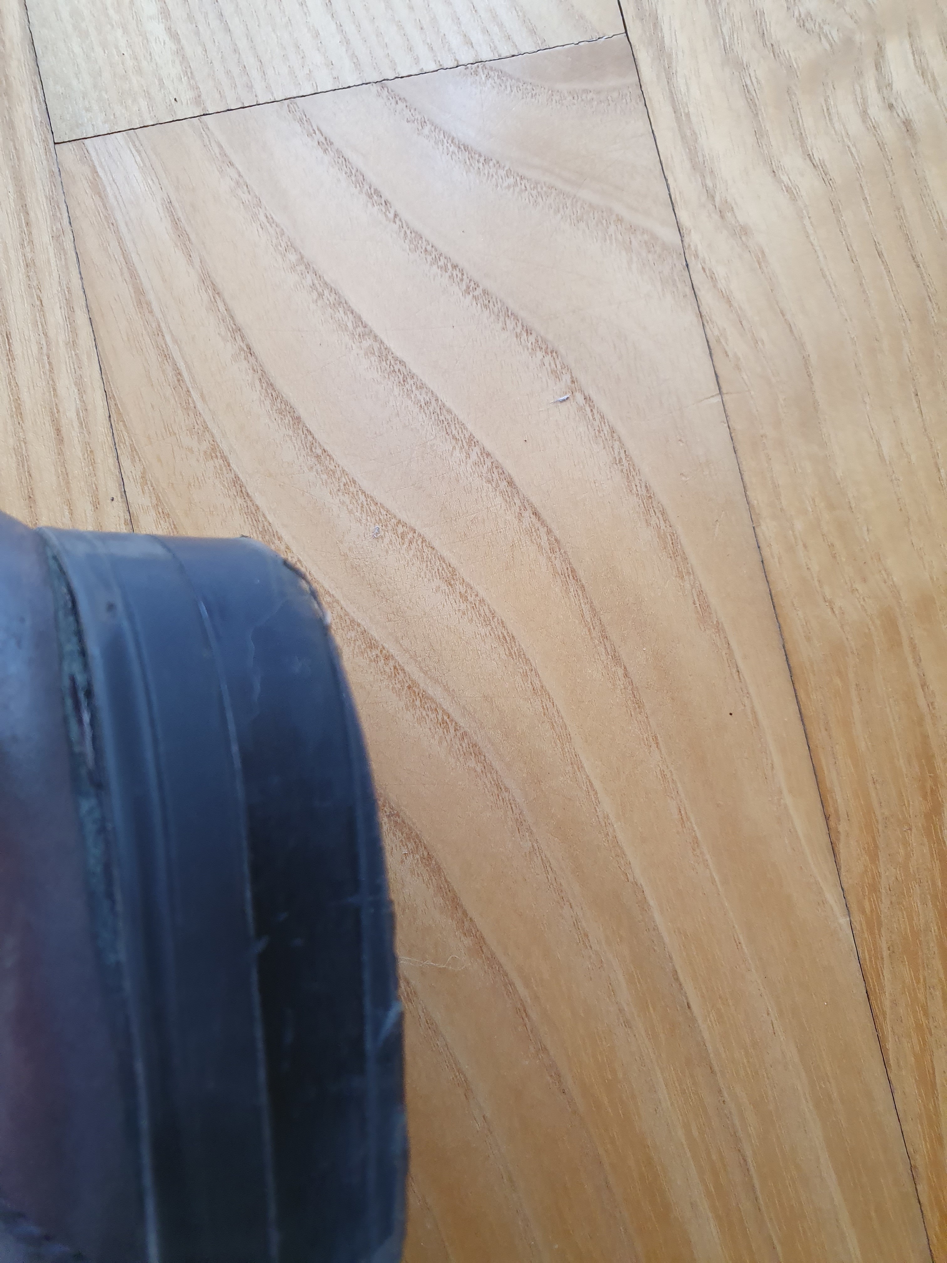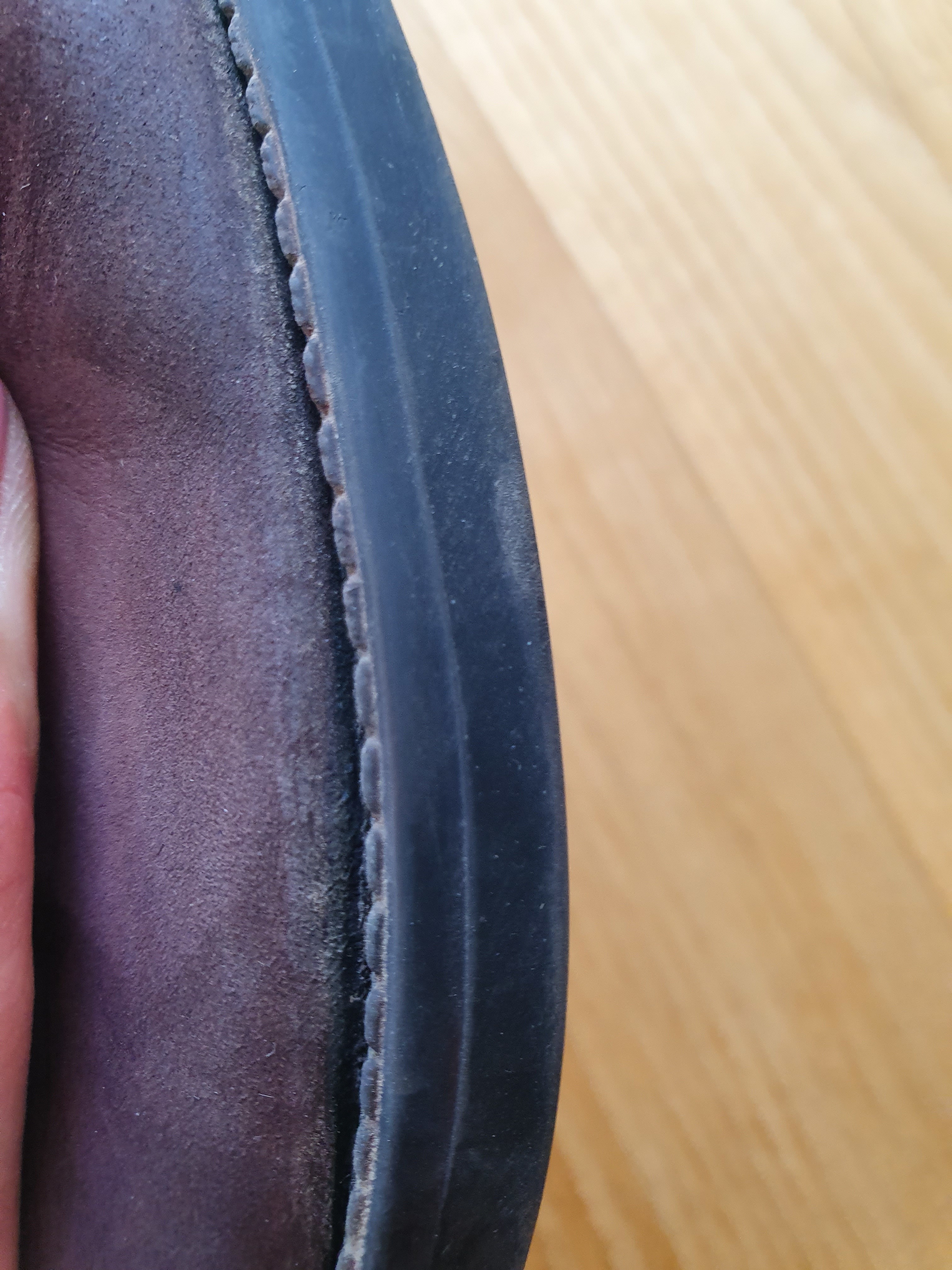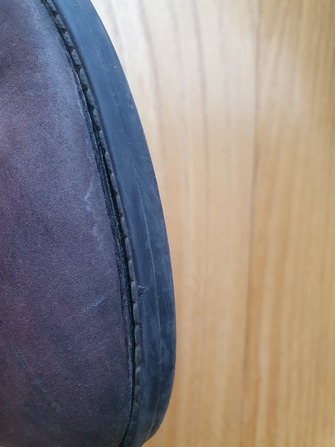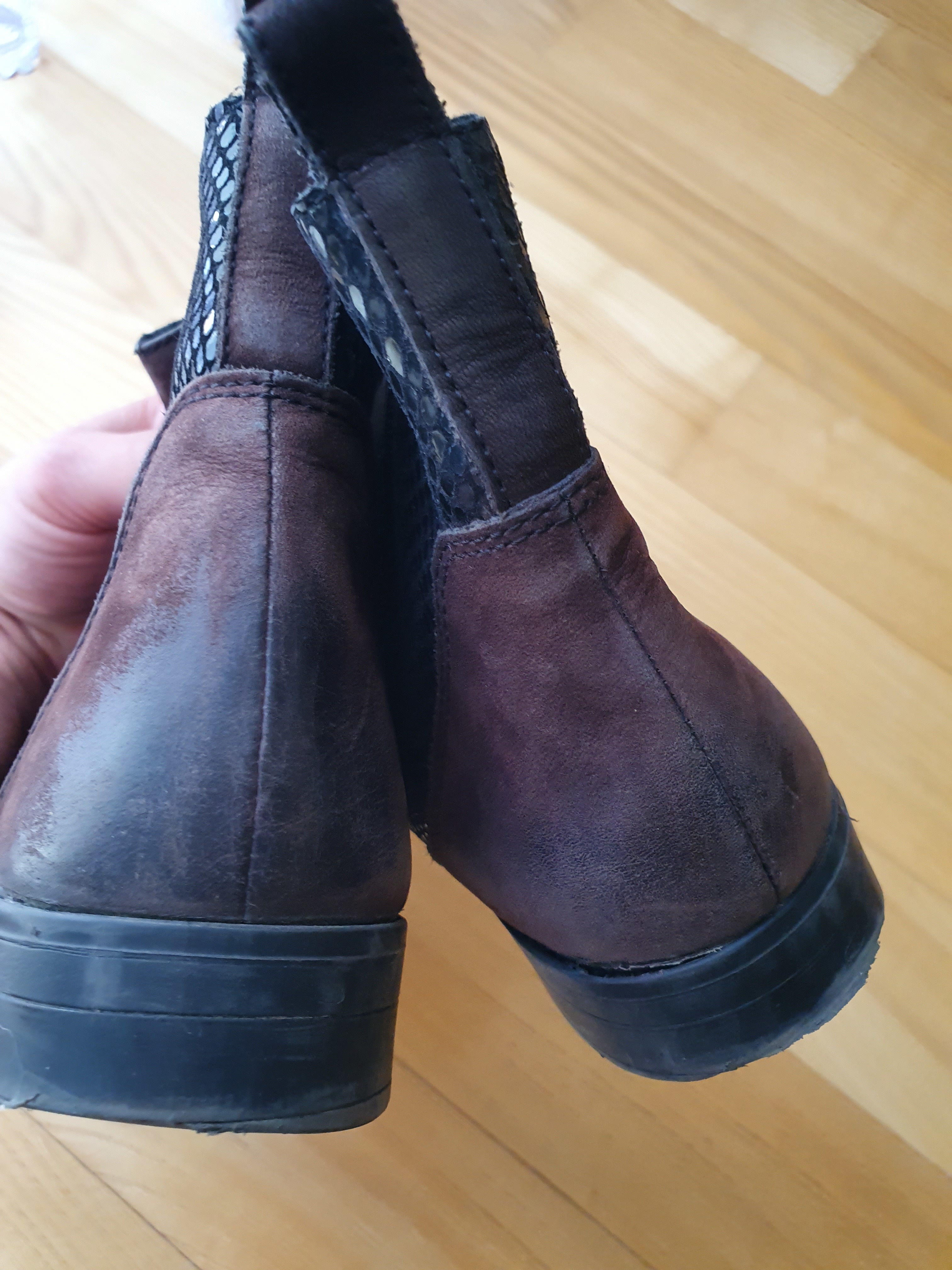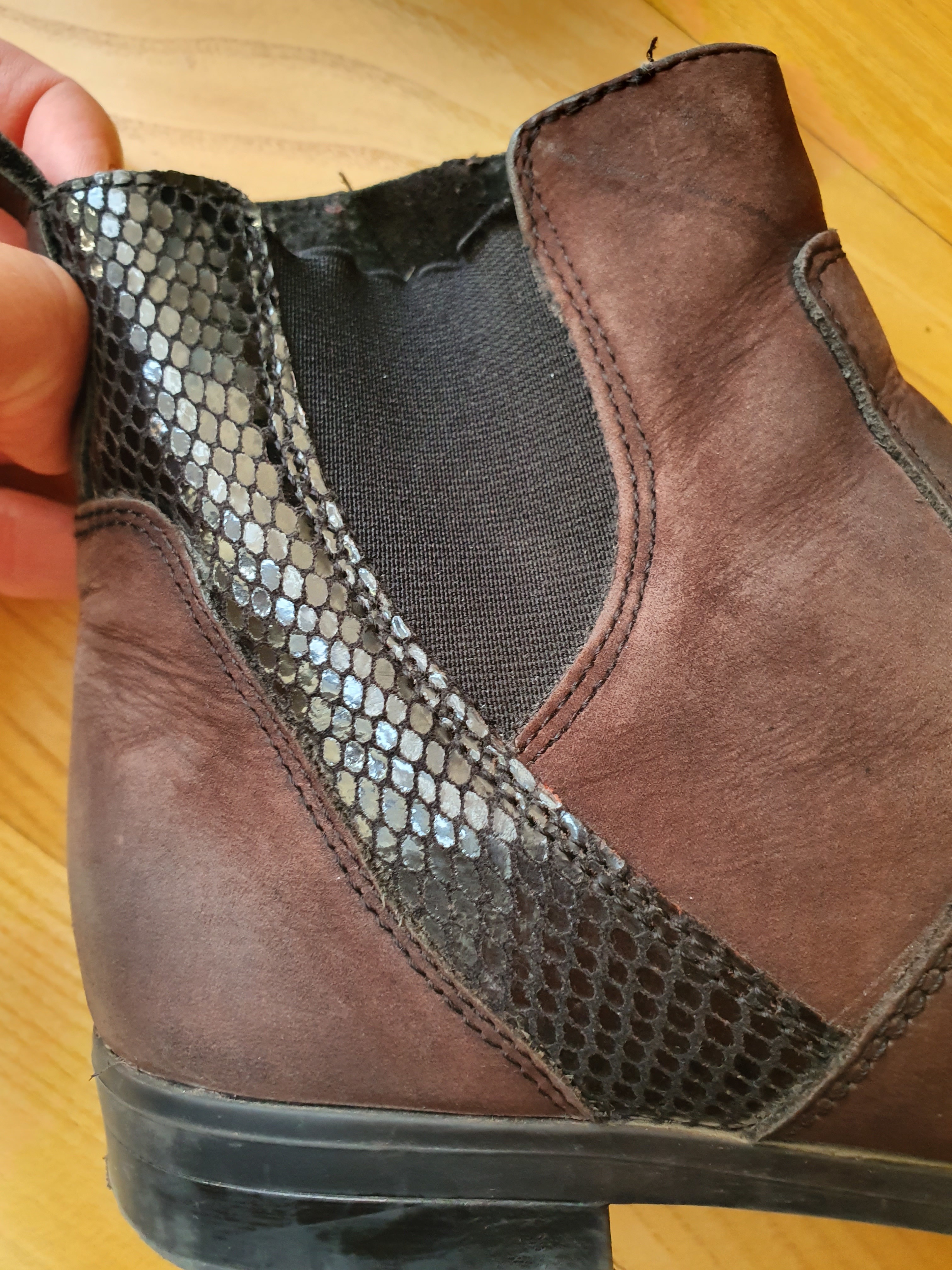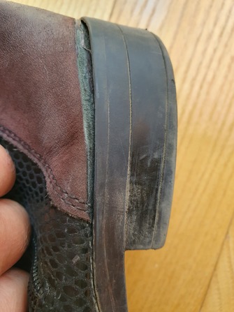Odklejenie podeszwy dookoła butów. zdarcie podeszwy w lewym bucie, rozciągnięcie gumy w prawym bucie