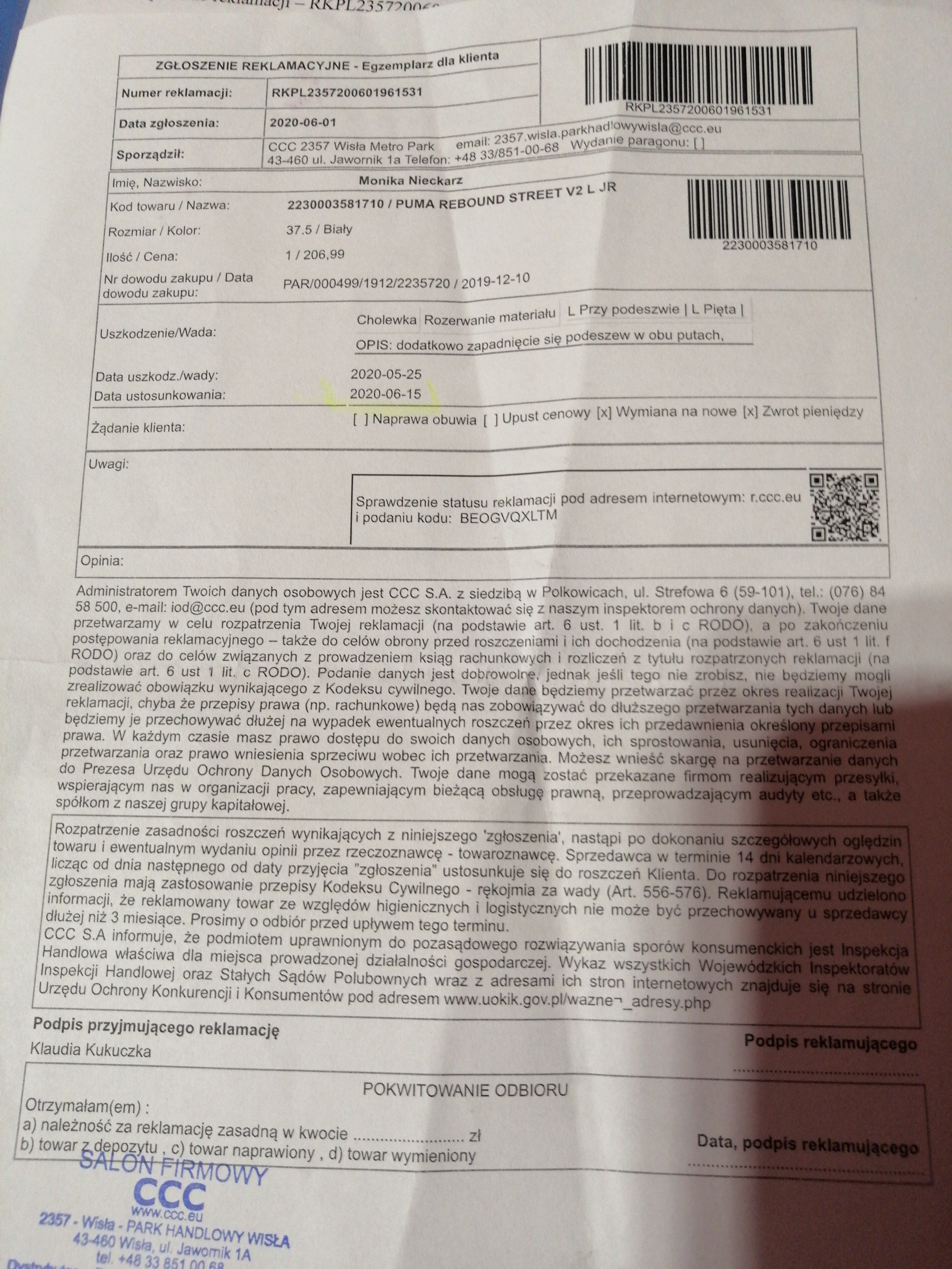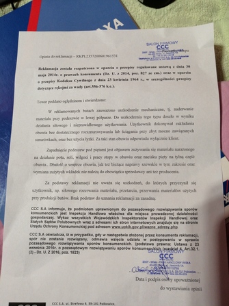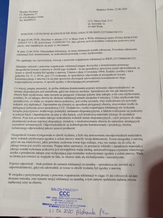Wniosek o ponowne rozpatrzenie reklamacji. Reklamacja złożona 02.06.2020 odrzucona. Powiadomiono mnie 13.06.2020. Data na piśmie 09.06.2020! Nieczytelny podpis pracownika. A formularz odmowy wygląda jak " gotowiec". Brak podstaw. Wmawia mi się, że uszkodzenia są mechaniczne. Córka waży 40 kg a podeszwy się zapadły. Buty używane 3 razy w tygodniu ok 2 godz. ( Po niespełna 6 miesiącach podeszwa od spodu ledwie starta). Buty nie otarte, zadbane z zewrzątrz. Obuwie jest wysokie, za kostkę. Sugerując niedostateczne rozsznurowywanie obuwia, niemalże jest niemożliwe ściągnięcie obuwia bez udziału rąk. Proszę o monitoring