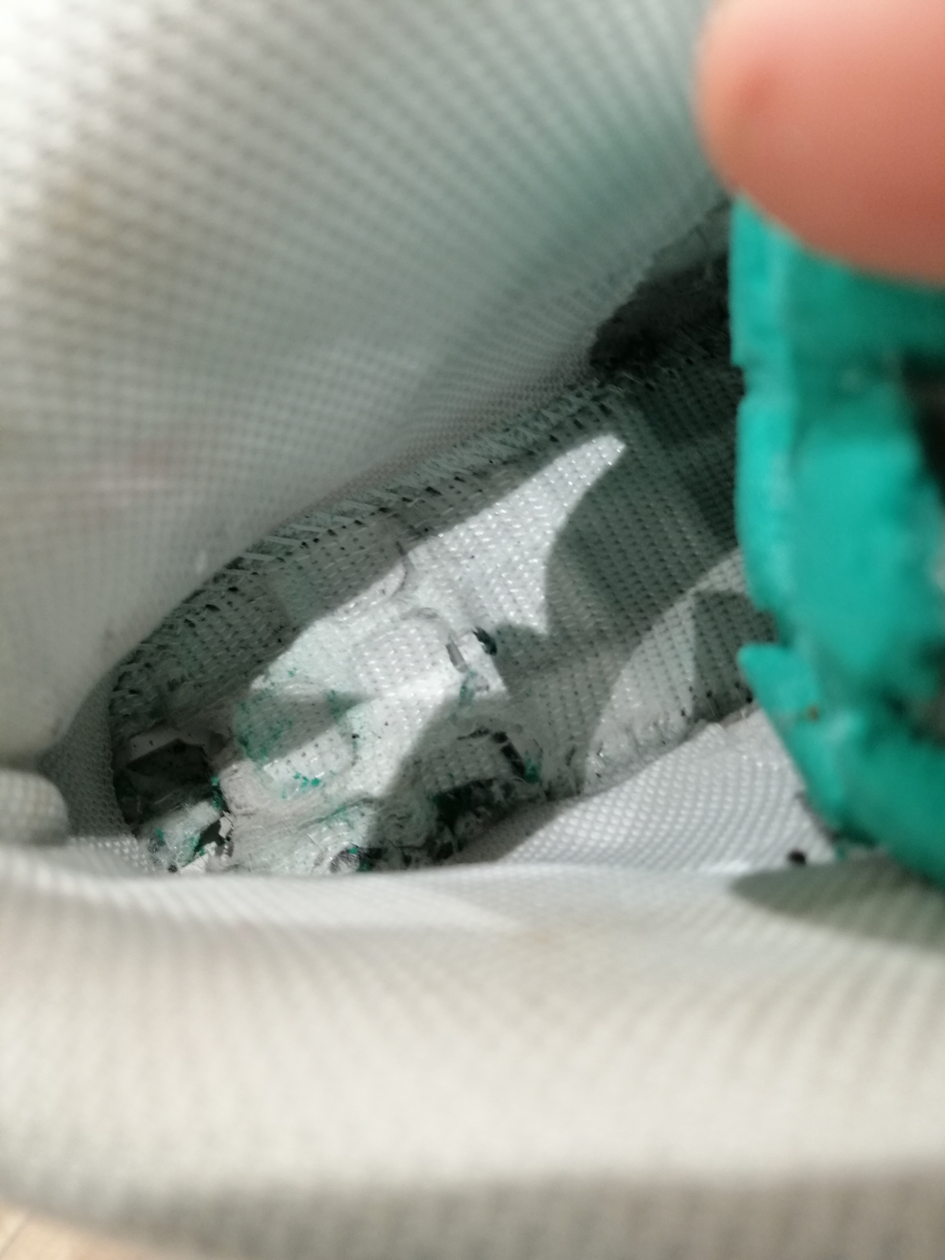 Zapadnięcie podeszw w obu piętach, Rozklejenie podeszwy przy pięcie w lewym bucie