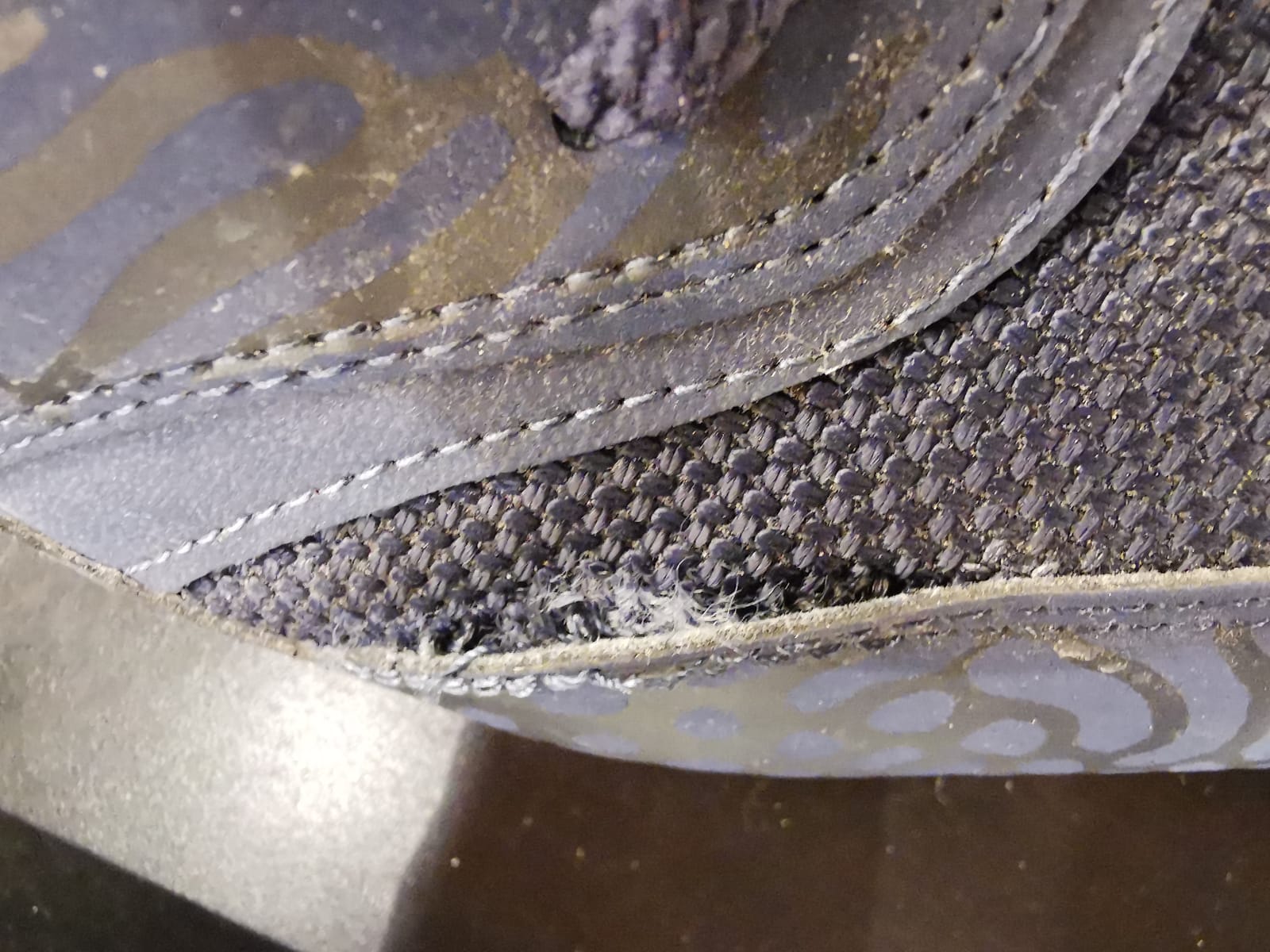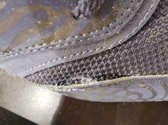 Pęknięcie szwu na cholewce łączącego dwie warstwy materiału. Miejsce waday - but prawy w przedniej prawej części wierzchniej
