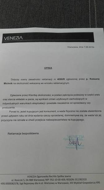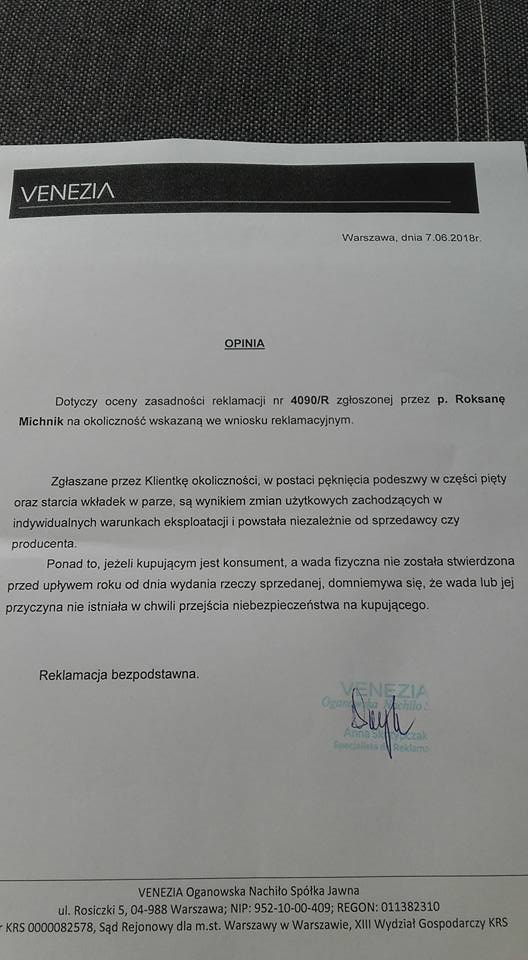 Reklamacja sandałów odrzucona. Kupione listopad 2016, buty użytkowane lato 2017 i początek sezonu 2018 (maj) i już buty nie nadają się do chodzenia.