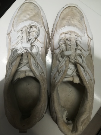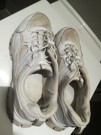 Bardzo proszę o pozytywne rozpatrzenie reklamacji, ponieważ widoczne i nieestetyczne wady, które pojawiły się mimo rozważnego korzystania z obuwia i właściwej pielęgnacji, uniemożliwiają korzystanie z butów, a rozerwana na pięcie siatka nie chroni stopy przed otarciami. Widoczne na zdjęciach plamy to właśnie odchodzący z butów klej, a nie brud. Na drugim zdjęciu częściowo widoczne są rozerwane na piętach siatki. Zdjęcia zrobione w dniu reklamacji.