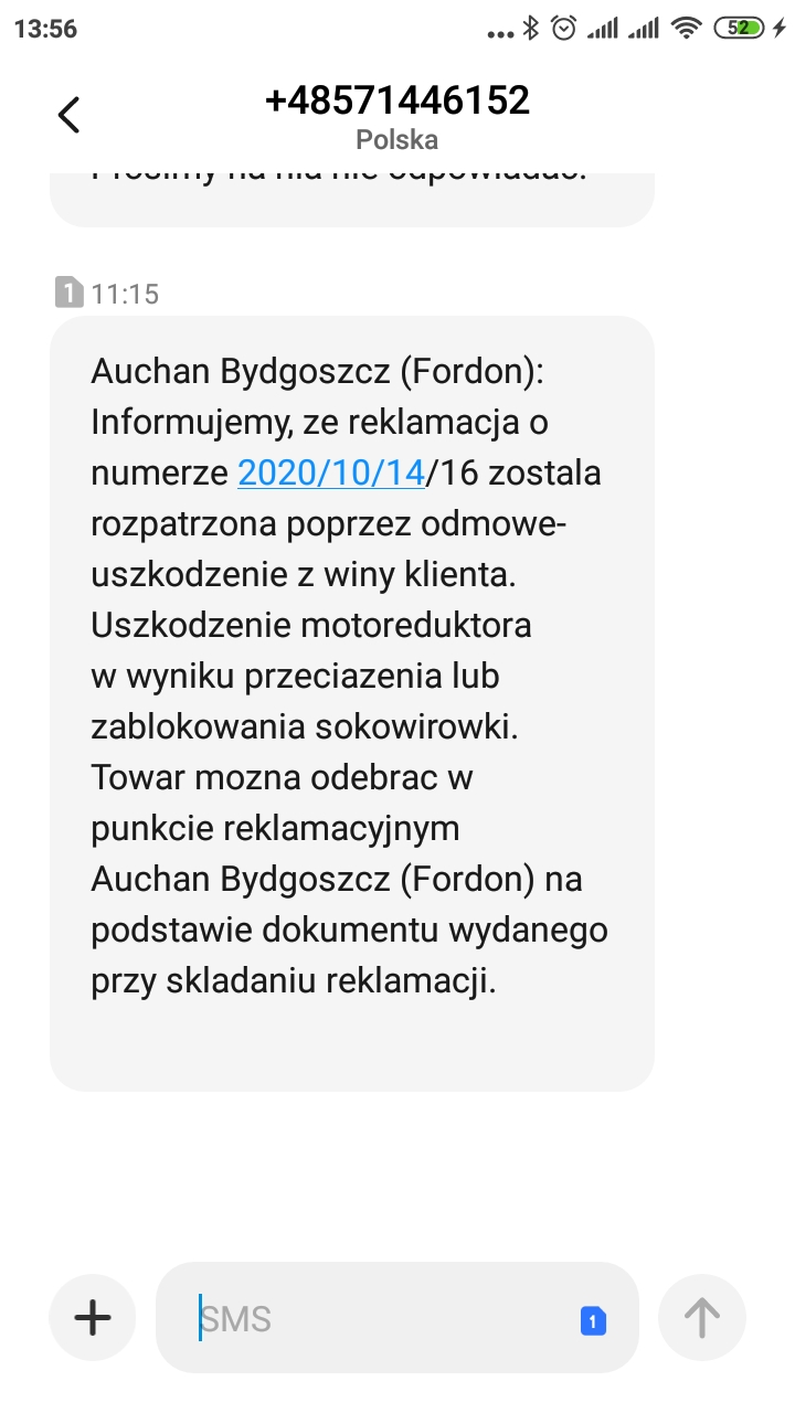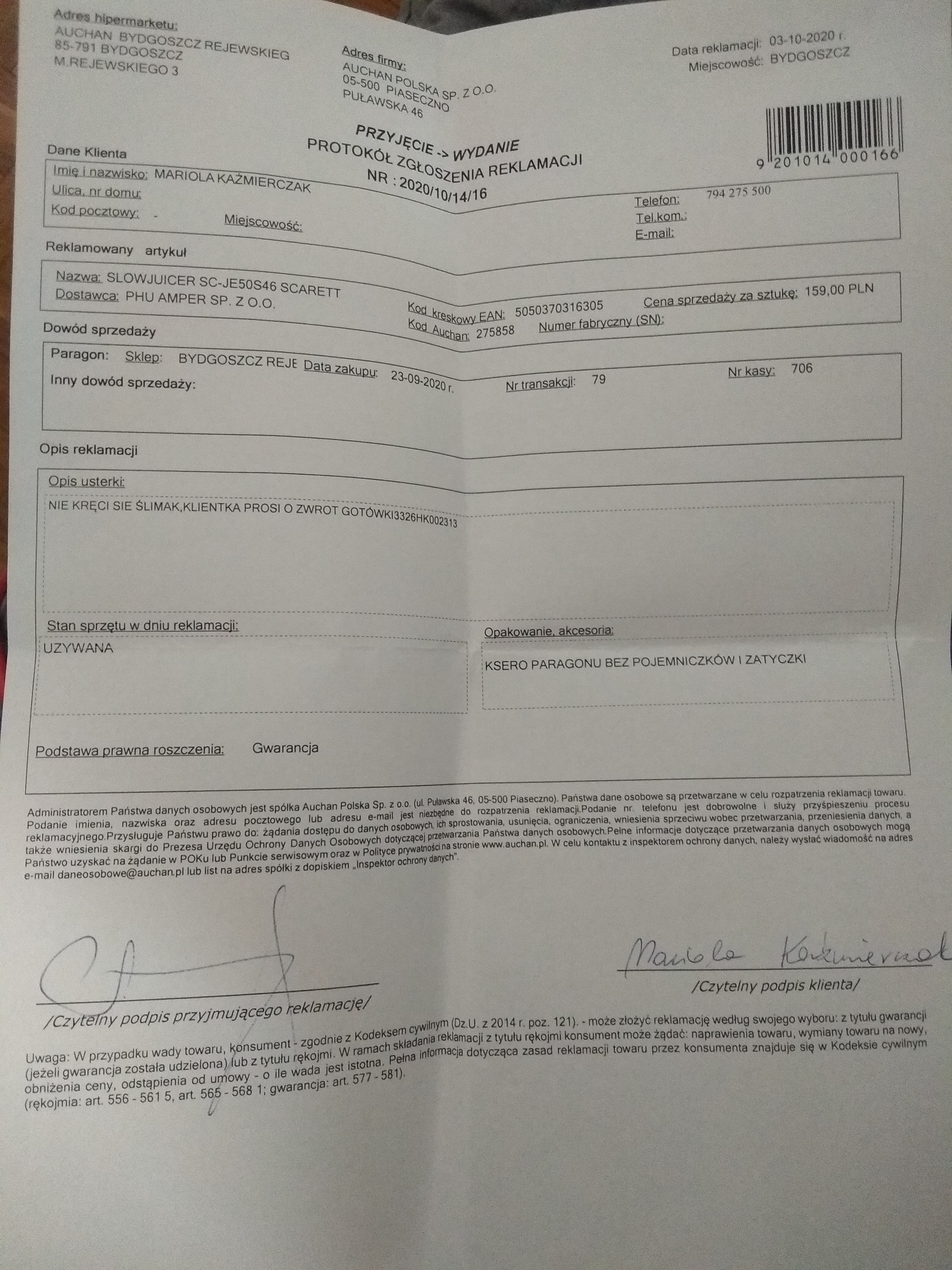 Sprzęt od zakupu użyłam pięć razy. Już za pierwszym razem przesunęła się pokrywa i sokowirówka stanęła. Ale zwaliłam to na moje użytkowanie. Tak bardzo byłam zachwycona tym zakupem, że uznałam, że to niemożliwe i że to przypadek. Potem zacinała się już za każdym razem. Pomyślałam - trudno, nie była zbyt droga, to niech pochodzi chociaż pół roku, potem kupię coś droższego. Niestety po ponownym zatkaniu, umyciu, złożeniu, ślimak przestał się obracać. Użyłam ją 5 razy w ciągu 9 dni. Sądziłam, że po złożeniu reklamacji bez problemu uzyskam zwrot pieniędzy. Niestety sklep nie uznał reklamacji. Pomysł ponownego wniosku zaczerpnęłam z tego portalu. Dziękuję Ps. Piszę sprostowanie, ponieważ jak zwykle nieznajomość prawa szkodzi i mnie zaszkodziła, zamiast rękojmi, która byłaby dla mnie korzystniejsza, pracownik wpisał gwarancję, co ja podpisałam. I tym samym adresatem mojej reklamacji stał się producent.