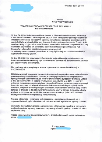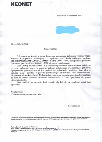 Firma NEONET nie uznała mojej reklamacji dobrowolnie. Trzykrotnie odwoływałam się od ich decyzji i zawsze otrzymywałam identyczną odmowną odpowiedz. Moja samodzielna "walka" z NEONET nie dała efektów. Skierowałam sprawę do Rzecznika Praw Konsumentów we Wrocławiu i dzięki nim po pół roku firma NEONET w końcu uznała moje żądania i oddała mi pieniądze za uszkodzoną lodówke. Serwis Czyuzna.pl udzielił mi dużo dobrych rad i wskazówek oraz skontaktował mnie z rzeczoznawca AGD z którego pomocy nie skorzystałam bo sprawa została załatwiona ale byłam gotowa iśc nawet do sądu. Dziękuję wszystkim osobą zaangażowanym w sprawę za pomoc.