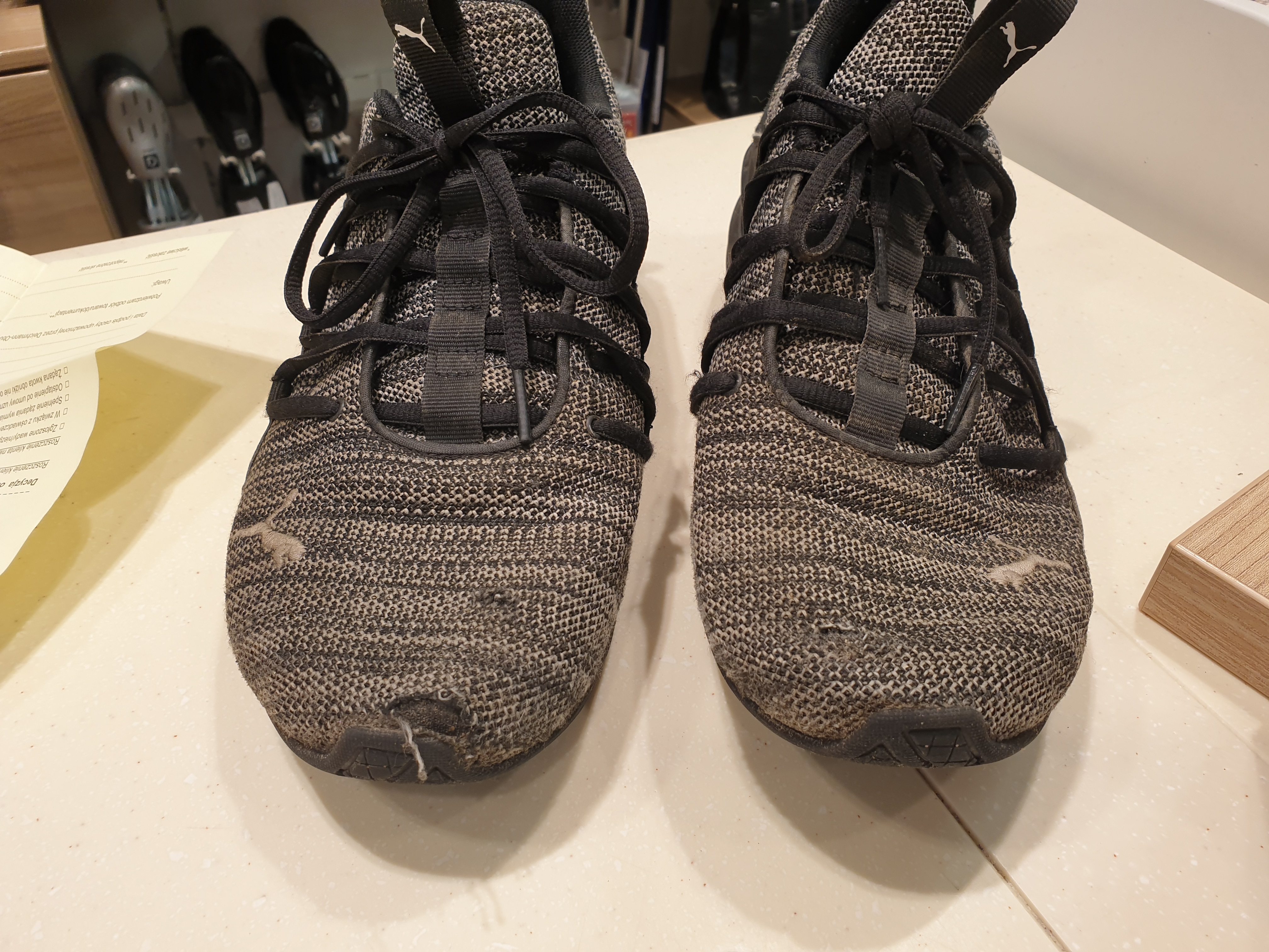 Rozdarty materiał na przodzie buta