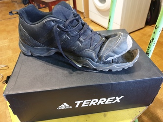 w butach odklejają się podeszwy: w lewym - całkowicie na długości ok. 10 cm od czubka, w prawym - po lewej stronie czubka, na odcinku ok. 4 cm.