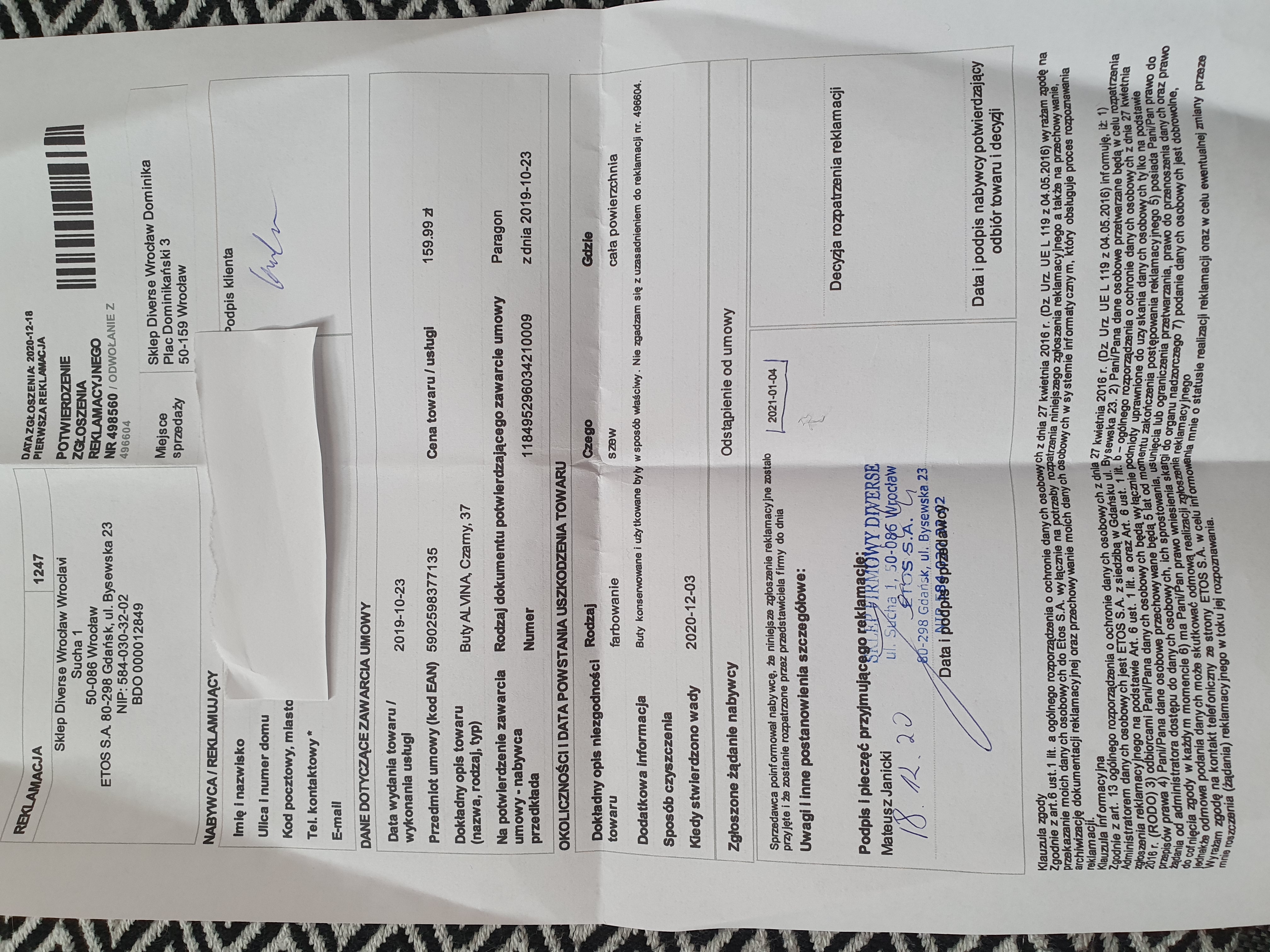 Odwołanie do negatywnie rozpatrzonej reklamacji 496604. Odbarwienie kleju wokół obu butów przy podeszwie. Buty były konserwowane i użytkowania w sposób właściwy. Nie zgadzam się z uzasadnieniem do reklamacji nr 496604.