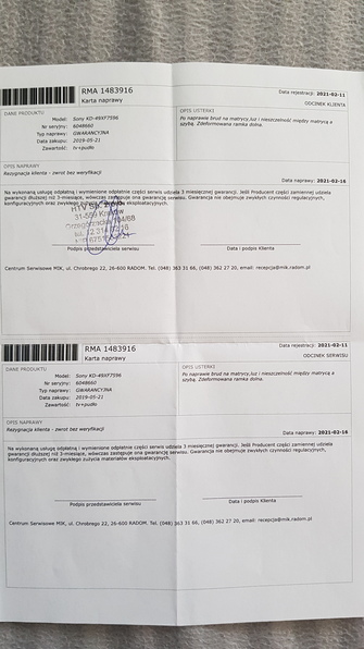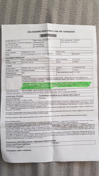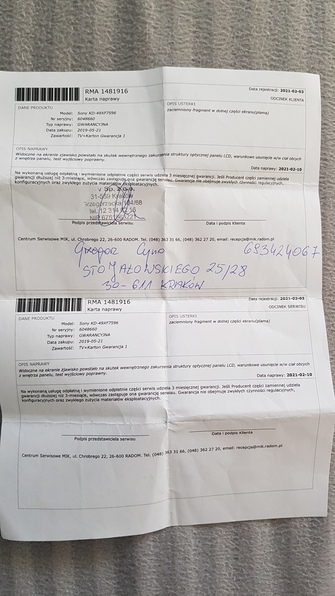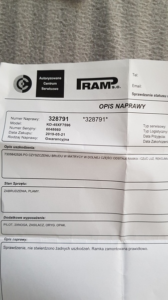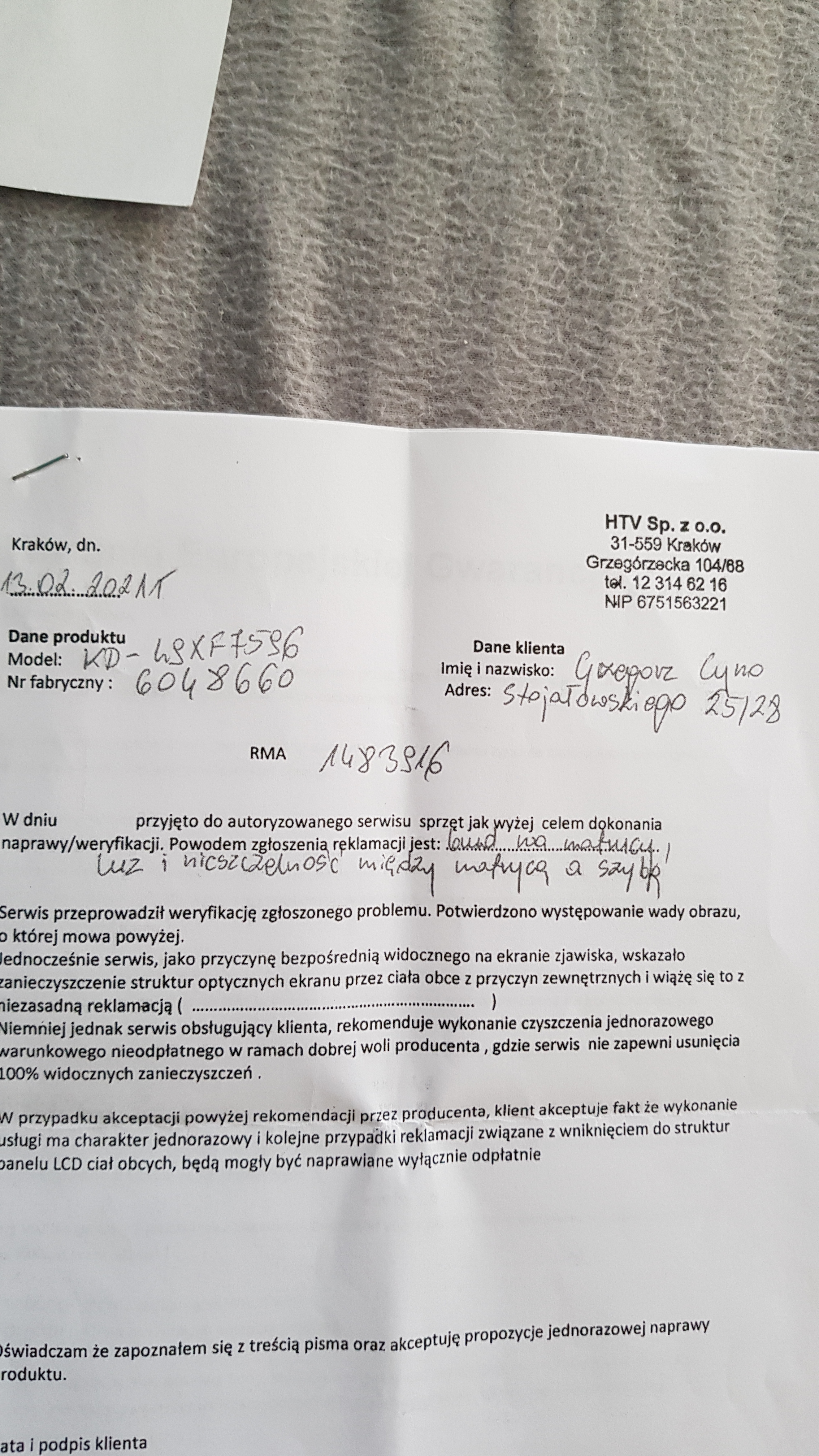 Po naprawie gwarancyjnej w serwisie HTV Sp. z o.o. 31-559 Kraków ,Grzegórzecka 104/68 oddano telewizor w gorszym stanie niż przed naprawą .Mianowicie: na matrycy było kilka ziarenek brudu.Po trzykrotnym dmuchnięciu w okolice dolnej części ekranu jedno z ziarenek wypadło. Świadczy to o tym że ekran jest rozszczelniony.Pojawił się luz między matrycą a zewnętrzną szybą ekranu. Następnie telewizor oddałem do sklepu na gwarancję z tytułu rękojmi. Po czternastu dniach otrzymałem wiadomość SMS ze sklepu Rtv Euro AGD o treści.:REKLAMACJA NIE MOŻE BYĆ UWZGLĘDNIONA.ZGŁOSZONA WADA NIE PODLEGA ODPOWIEDZIALNOŚCI SPRZEDAWCY. Z serwisu w którym znalazł się tv ( PRAM S.C. 01-303 Warszawa ul.Połczyńska 115b) .otrzymałem opis naprawy: SPRAWDZENIE , NIE STWIERDZONO ŻADNYCH USZKODZEŃ.RAMKA ZAMONTOWANA PRAWIDŁOWO. Natomiast jako stan sprzętu wpisano:ZABRUDZENIA ,PLAMY.