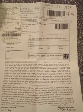 Początkowo reklamację odrzucono. Ponownie odeslana do rozpatrzenia 04.03.2019