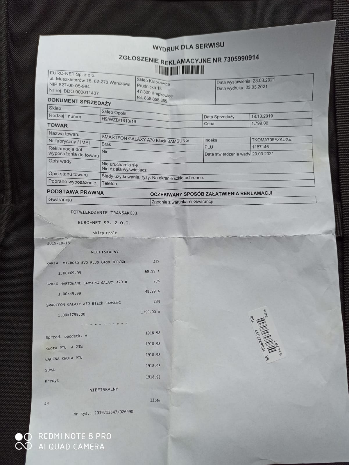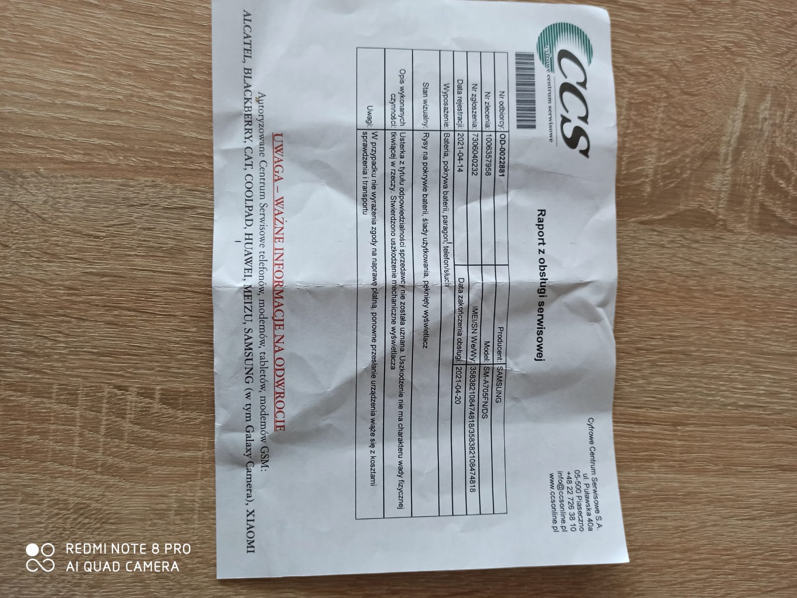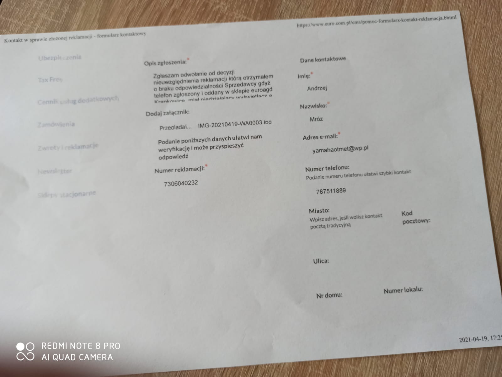 Smarfton oddałem do reklamacji w sklepie stacjonarnym z drobnymi rysami na obudowie baterii a otrzymałem z powrotem z potłuczonym wyświetlaczem i nie uznali reklamacji z powodu uszkodzeń mechanicznych,pracownik sklepu podczas przyjmowania zgłoszenia zrobił zdjęcia telefonu i dokonał opisu stanu w jakim jest smartfon w chwili oddania do reklamacji.Oddałem nie działający telefon w dobrym stanie zewnętrznym a otrzymałem potłuczony i obity.Złożyłem ponownie reklamację z opisem jak wyżej i znowu odmowa nie dość że nie naprawiają to jeszcze mi go potłukli,ponownie to zgłosiłem tym razem w formularzu kontaktowym kontaktowym na stronie euroagd i znowu odmowa, napisałem i-meil Zgłoszenie: {SrvReqNo:[8000274331]} i dostalem listownie odpowiedż od pani Specjality ds. Obsługi Klienta że reklamowany towar posiada uszkodzenia mechaniczne które nie podlegają odpowiedzialności gwaranta i sprzedawcy precierz te uszkodzenia oni spowodowali ,są zdjecia i opisy ja im to wyjaśniam a oni nie umieją czytać ze zrozumieniem czy o co chodzi, ludzi za głupców mają.Dziś napisałem kolejnego e-maila i czekam ustawowe 14 dni na odpowiedż moich żądań jak nie zrozumieją idę do rzecznika praw konsumenta.