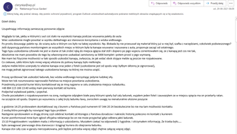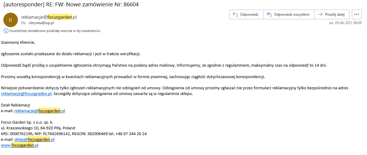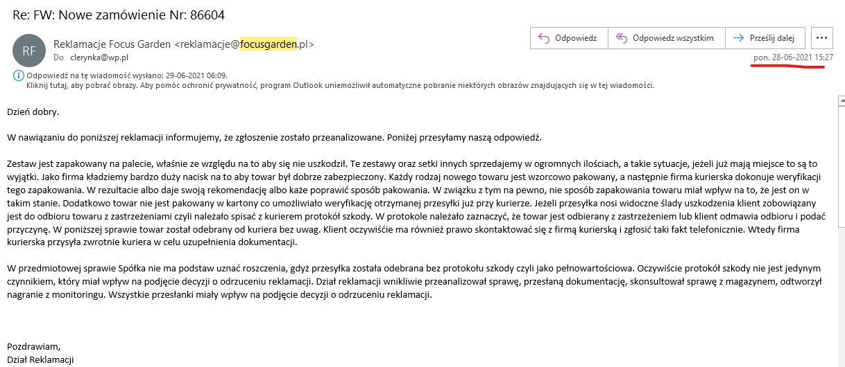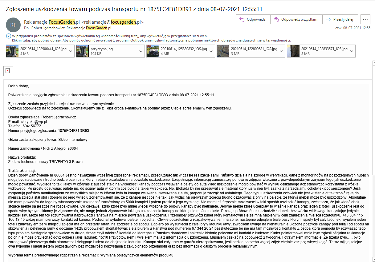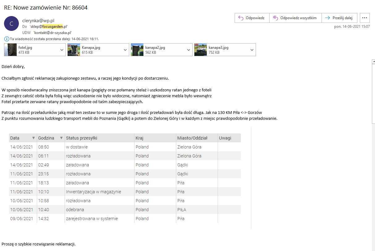Dzień dobry Jest to nawiązanie do wcześniej zgłoszonej (14.06.2021) mailowo reklamacji odrzuconej przez Państwa. 02.06.2021 Zamówienie produktu 14.06.2021 Dostarczenie produktu przez kuriera 14.06.2021 Zgłoszenie mailowe reklamacji (brak numeru reklamacji) 28.06.2021 Odrzucenie reklamacji, przyczyna, nie możliwe by kurier tak to uszkodził, bo my pakujemy dobrze. no skoro nie kurier to kto? Rozumiem, że ja mam takie hobby zamawiam kanapy za 5K i je łamię. 29.06.2021 Uzupełnienie reklamacji o zdjęcia i prawodopodobną przyczynę powstania uszkodzenia, mimo zapewnień autorespondera o tym, że odpowiadamy max po 14 dniach, braku odpowiedzi 08.07.2021 Ponowne zgłoszenie reklamacji tym razem przez formularz reklamacyjny i brak reakcji (poza autoresponderem) Przedluzajac tak w czasie realizację reklamacji sami Państwo działają na szkode w weryfikacji. dane z monitoringów na poszczególnych hubach mogą być nadpisane i trudno będzie ocenić na którym etapie przeładowania powstało uszkodzenie. Uzupełniając informację zamieszczę ponownie zdjęcia, włącznie z prawdopodobnym zarysem tego jak uszkodzenie mogło powastać. Wygląda to tak, jakby w którymś z aut coś stało na wysokości kanapy podczas wsuwania palety do auta Wiec uszkodzenie mogło powstać w wyniku delikatnego acz stanowczo korzystania z wózka widłowego. Po prostu dosuwając palete np. do sciany auta w którym cos było na takiej wysokości. Np. Blokada by nie przesuwał się materiał który już w niej był, szafka z narzędziami, cokolwiek podwieszonego? Jeśli dysponują państwo monitoringiem ze wszystkich miejsc w którym była ta kanapa wsuwana i wysuwana z auta, proponuje zacząć od ostatniego. Tego typu uszkodzenia człowiek nie jest w stanie ot tak zrobić ręką do miejsca zgięcia stał stół i dopiero po jego wyjeciu zorientowałem się, ze z kanapą jest cos nie tak. Jak widac na pierwszym zdjęciu trudno oszacować z bryły na palecie, że któryś mebel może być uszkodzony. Absolutnie nie mam powodów do tego by własnoręcznie uszkadzać zamówiony za 5000 komplet i potem prosić o jego wymianę. Nie mam też fizycznie możliwości w taki sposób uszkodzić kanapy, zwłaszcza, że jak widać obok stojące meble są jeszcze nie rozpakowane. Co ciekawe, szkło które było mniej więcej włożone do połowy kanapy było nietknięte. Jedyne meble które ucierpiały to właśnie kanapa oraz jeden z foteli (uszkodzenie jest od spodu więc byłbym skłonny je zignorować), nie mogę jednak zignorować takiego uszkodzenia kanapy na której nie można usiąść. Proszę spróbować tak uszkodzić ładunek, bez wózka widłowego korzystając jedynie ludzkiej siły. Może ten tok rozumowania naprowadzi Państwa na miejsce powstania uszkodzenia. Przedmioty przywiózł kurier który kontaktował się ze mną najpierw w celu znalezienia miejsca rozładunku. +48 884 115 166 13:40 widzę mam pierwszy kontakt od kuriera. Podjechal wyladowal palete, i pojechal. Chwile poczekałem z rozpakowywaniem na zonę, następnie odpiąłem białe pasy którymi spiety był caly ladunek, wyjalem jeden fotel i zauwazylem ze w miejscu spięcia ma on przetarty ratan. na szczęście od spodu. Dopiero po wysunieciu z całej bryly ladunku ławy, zwrocilem uwagę na nienaturalnie ułożone poszycie kanapy pod folią i od spodu na skrzywienia i pękniecia ramy o godzinie 14:25 probowalem skontaktować się z biurem u Państwa pod numerem 67 344 20 24 bezskutecznie bo nie ma tam możliwości kontaktu Z osobą która pomogła by rozwiązać tego typu problem Następnie sprobowalem w drugą stronę czyli odebrać kontakt od ktoregos z Panstwa doradcow i nakreslic historię polecono mi kontakt z kurierem Kurier poinformowal mnie bym zglosil oficjalna reklamacje bo on nie może przyjechać gdyż odbiera jakiś ladunek. 15:10 Przygotowałem i wysłałem maila z informacją o uszkodzeniu. Musiałem czekać na odpowiedź 2 tygodnie. I otrzymałem informację. Że trzeba było….. było zareagować pierwszego dnia stanowczo i ściągnąć kuriera do obejrzenia ładunku. Kanapa stoi cały czas w garażu nierozpakowana, jeśli będzie potrzeba więcej zdjęć chętnie załączę więcej zdjęć. Teraz mijają kolejne dwa tygodnie i nadal jestem pozostawiony bez możliwości korzystania z zakupionego przedmiotu oraz bez informacji o dalszym procesie reklamacyjnym. Wybrana forma preferowanego rozpatrzenia reklamacji: Wymiana pojedynczych elementów produktu Obecnie uważam, iż odstąpienie od umowy także było by satysfakcjonującym mnie rozwiązaniem, gdyż połowę sezonu przemęczyłem się bez korzystania z zamówionej kanapy.