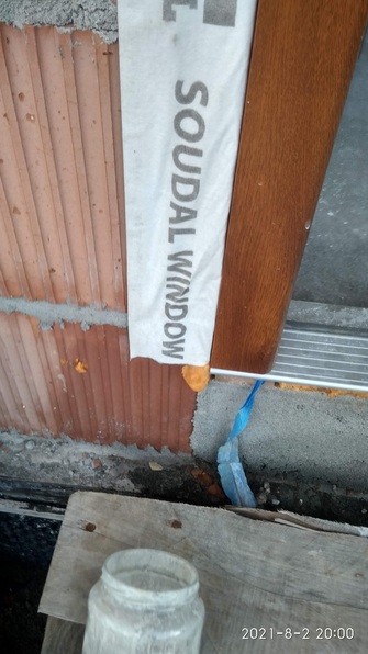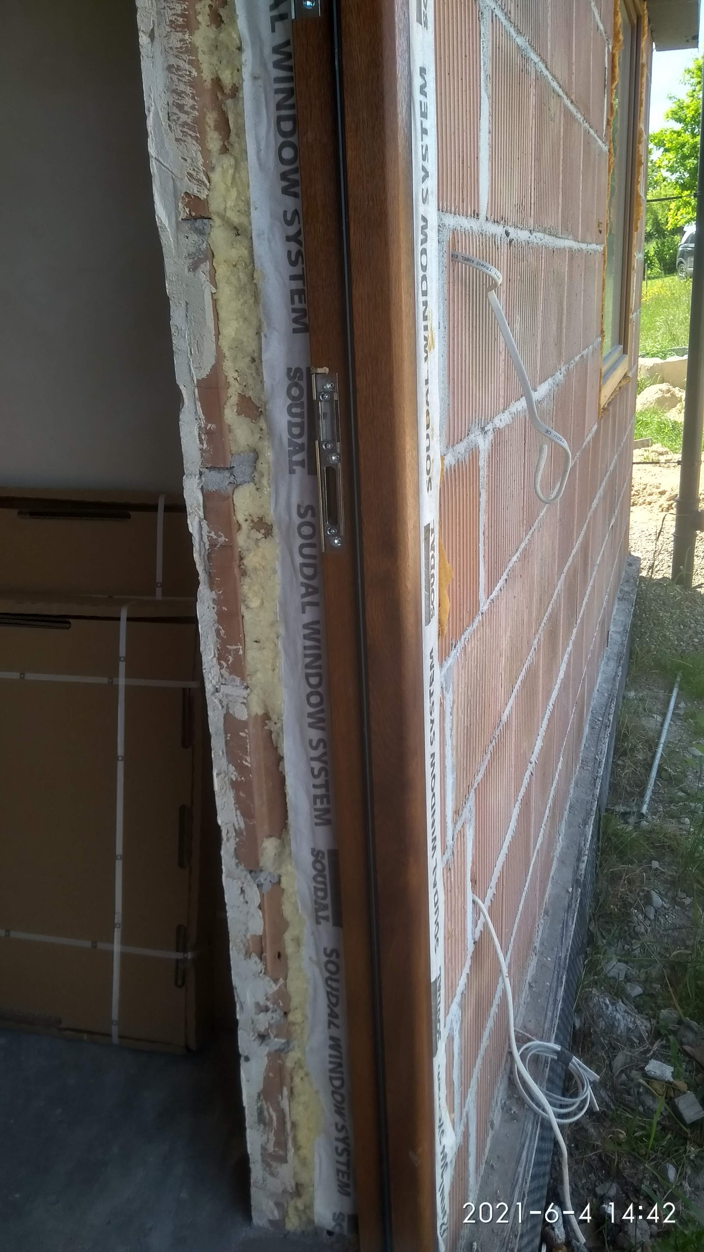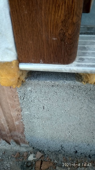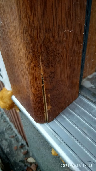 Źle zamontowane drzwi,nie dokręcona śrubka w zamku spowodowała uszkodzenie ościeżnicy na wysokości zamka z prawej strony, nieszczelność w montażu ,podmoknięcia podłogi wewnątrz budynku,źle zamontowana kotwa z prawej zewnętrznej strony, pęknięcie z lewej strony ościeżnicy.