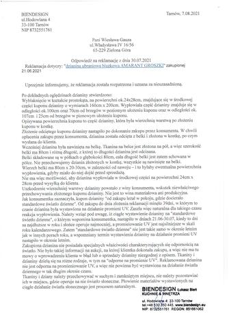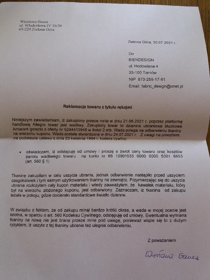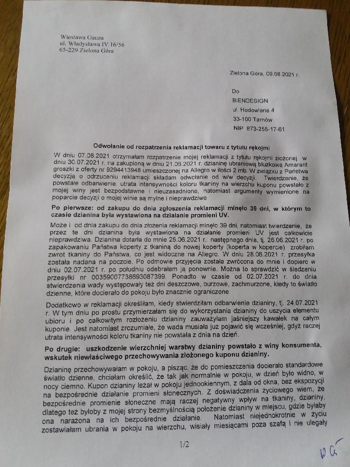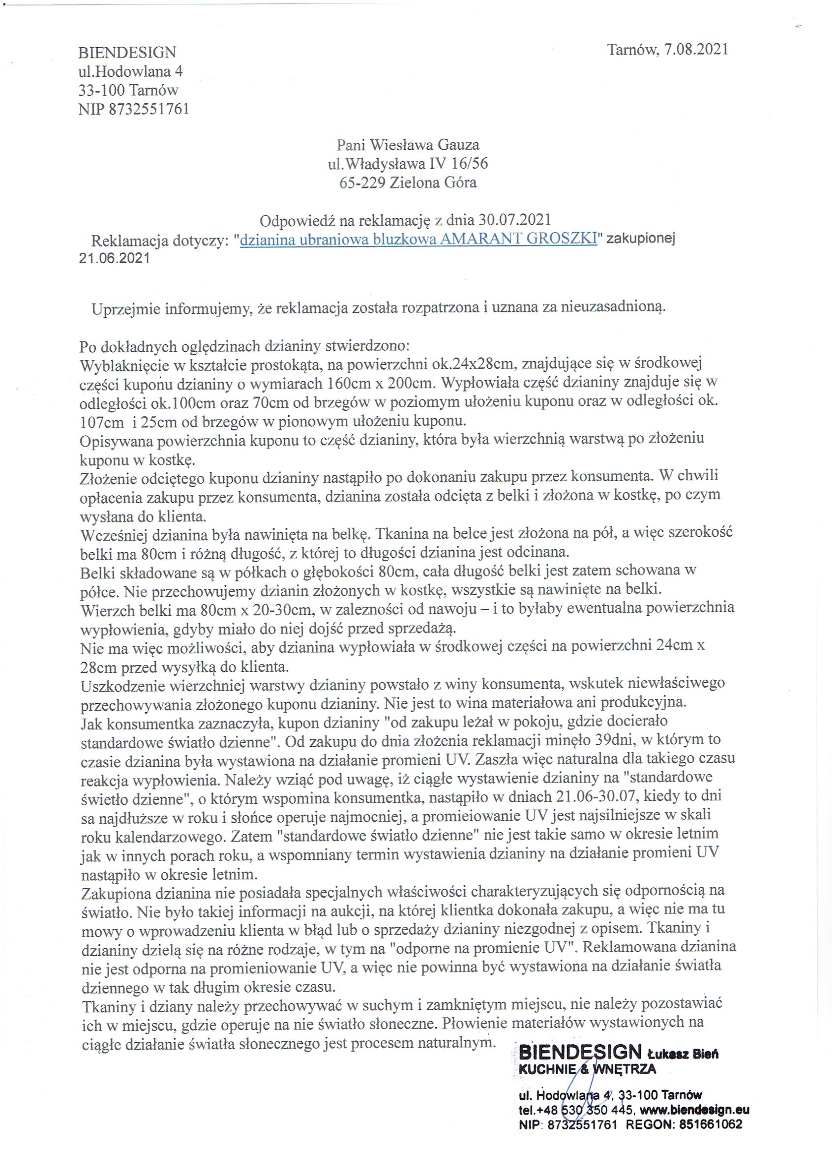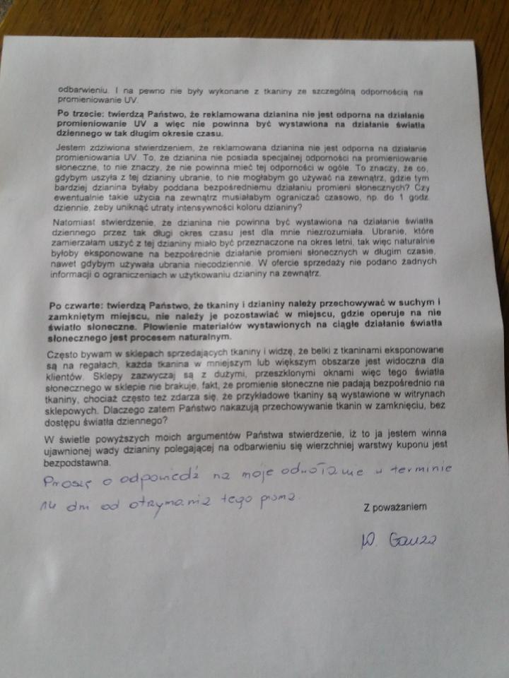 uzasadnienie odmowy jest mylne i niezgodne z faktami. Wskazanie kupującego jako winnego ujawnionej wady dzianiny jest bezzasadne. Moje argumenty przedstawiłam w odwołaniu do decyzji Sprzedawcy o odrzuceniu reklamacji