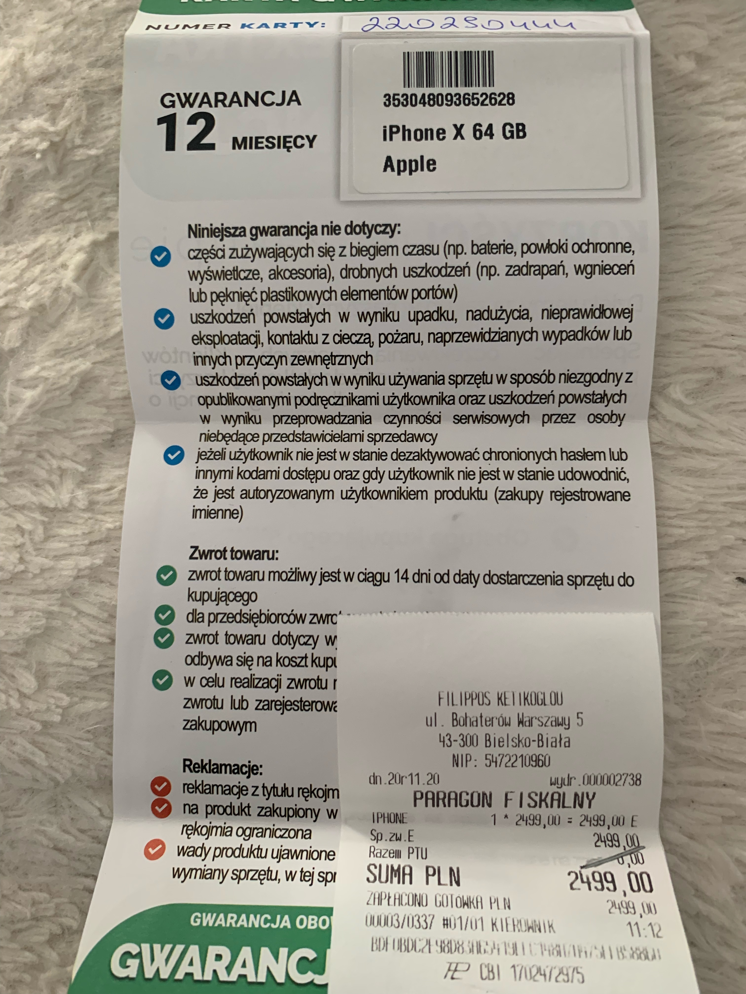 problem z telefonem - Iphone X polega na tym, że telefon samoczynnie się wyłącza w trakcie rozmowy, po ok. 3 min jej trwania. Dotyczy to każdej rozmowy, wychodzącej i przychodzącej. W ramach 1. reklamacji wymieniono telefon na "nowy", także wadliwy, gdyż z pewnością nowym telefonem nie był i nosił ślady kleju na obudowie - uczulam na to, ponieważ p. Ketikoglou sprzedaje telefony jako nowe lub powystawowe - poddaje to w watpliwosć - z pewnoscią nie są warte swojej ceny. W dn. 06.09.2021 złożyłam 2. reklamację z tytułu rękojmi z odstąpieniem od umowy. p. Ketiglou nie odniósł się do reklamacji w czasie ustawowym tj. 14dni. Mamy 22.09.2021 a środki zwrotne nadal nie wpłynely na moje konto.