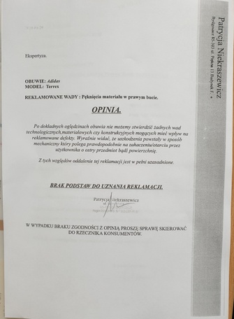 Opinia w odpowiedzi na reklamację to jakaś kpina jak mogłem uszkodzić mechanicznie buta w miejscu łączenia z gumową podeszwą po obu stronach buta. But po prostu się rozkleił w miejscu zginania się podczas użytkowania, drugi but był ok. Sprzedająca na eoryginalne.pl oraz na kilku kontach w allegro np. sport_okazje sprzedaje podrobiony towar co widać po jego komentarzach w aukcjach zarówno konta na Panią jak i na Pan o tym samym nazwisku z Bydgoszczy. Nie polecam zakupów u tych sprzedawców.