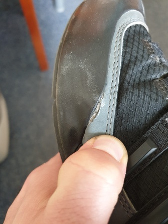 Rozklejenie buta w miejscu łączenia skóry z podeszwą po obu stronach buta.