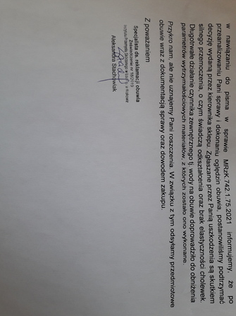 Nie uznano podając uzasadnienie::Zgłoszone usterki są skutkiem silnego przemoczenia bądź prania.Co doprowadziło do osłabienia parametrów wytrzymałościowych,przemoszeniu świadczy deformacja obuwia. Absurd totalny nigdy nie pralam obuwia ,nie wiedziałam że obuwie sportowe nie nadaje się na np deszcz.Po ponownym rozpatrzeniu znów odmowa .Buty użytkowane krótko, mniej niż rok,pomijam okres zimowy kiedy nie były w użyciu. Ten sklep to kpina i skurwielstwo:((Piszą co chcą i nic im nie zrobią.