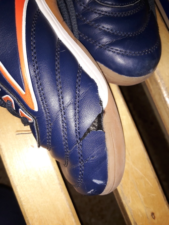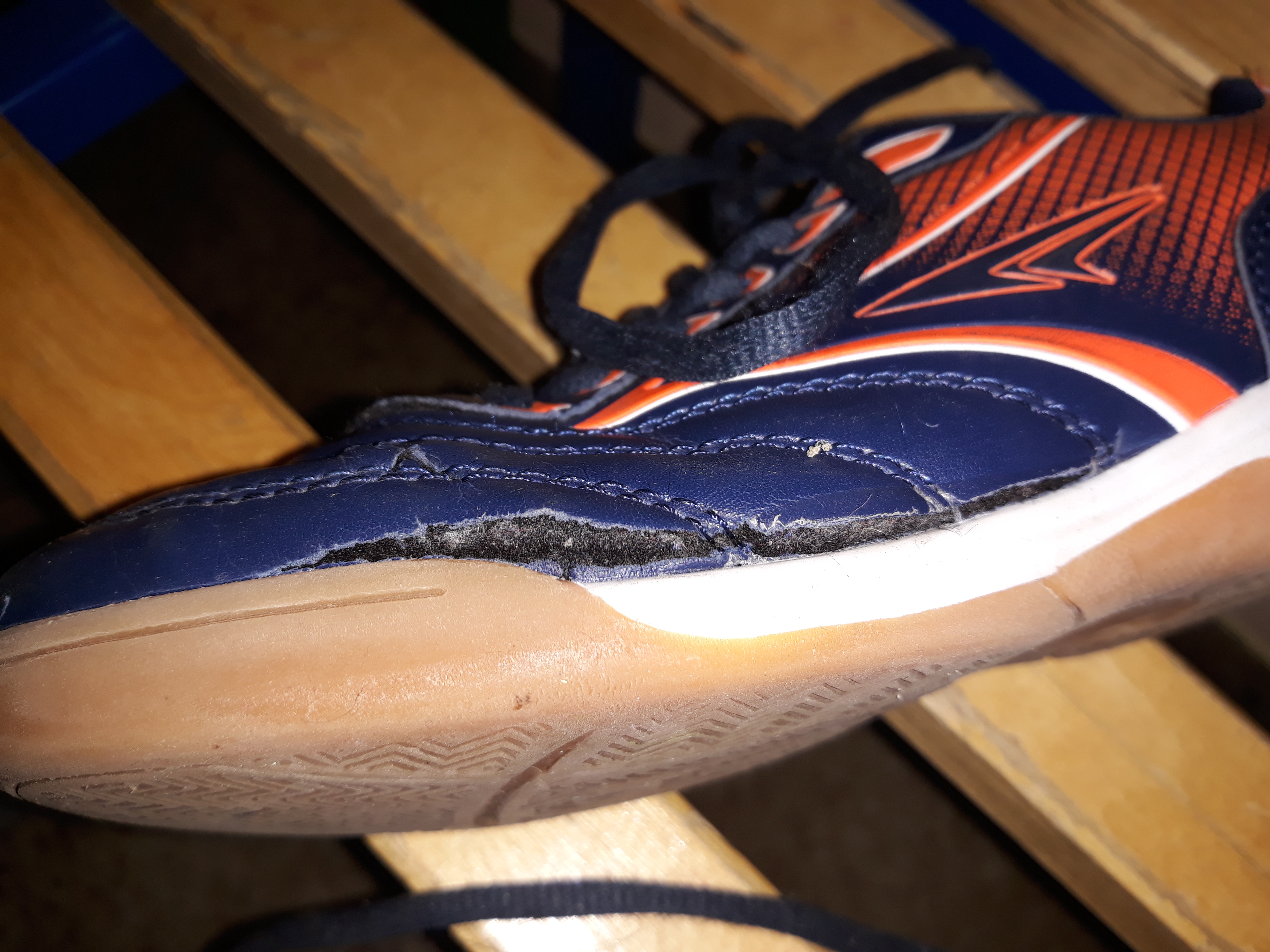 rozerwany materiał w zgięciu buta, oderwanie materiału przy podeszwie
