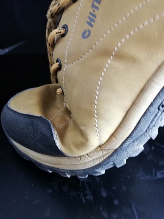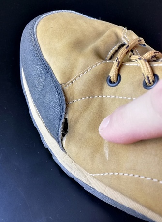 Pęknięcie lewego obuwia na zgięciu palców od strony zewnętrznej