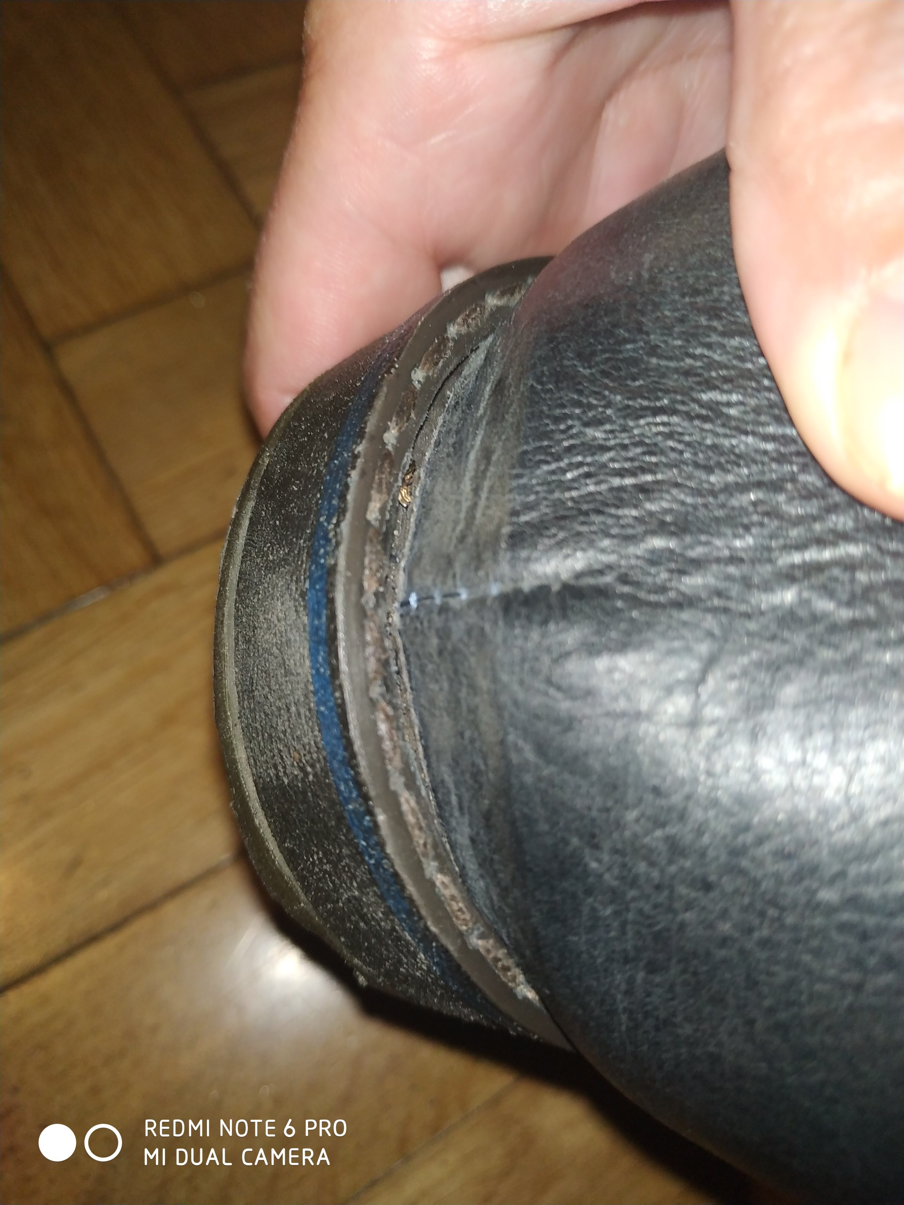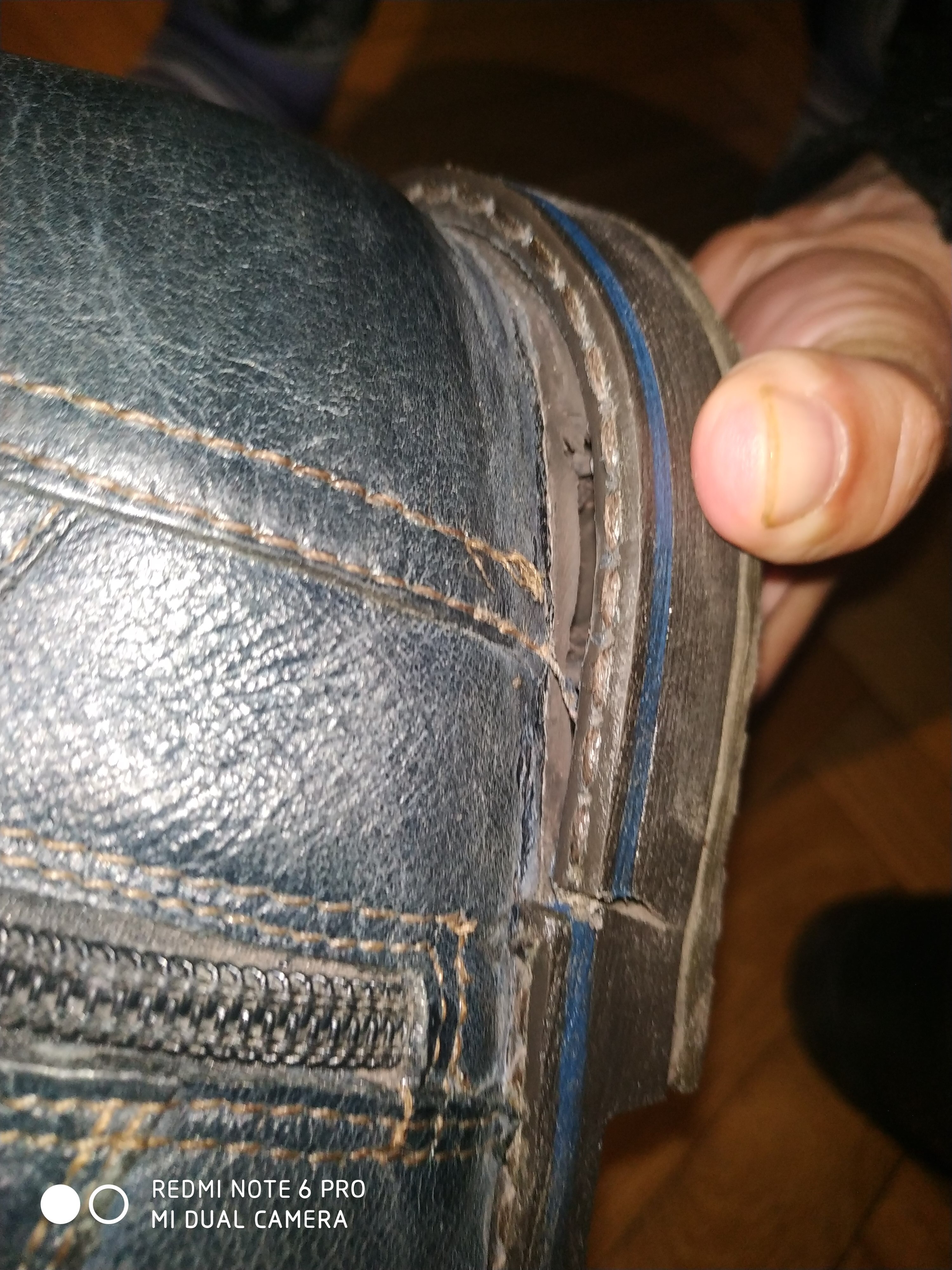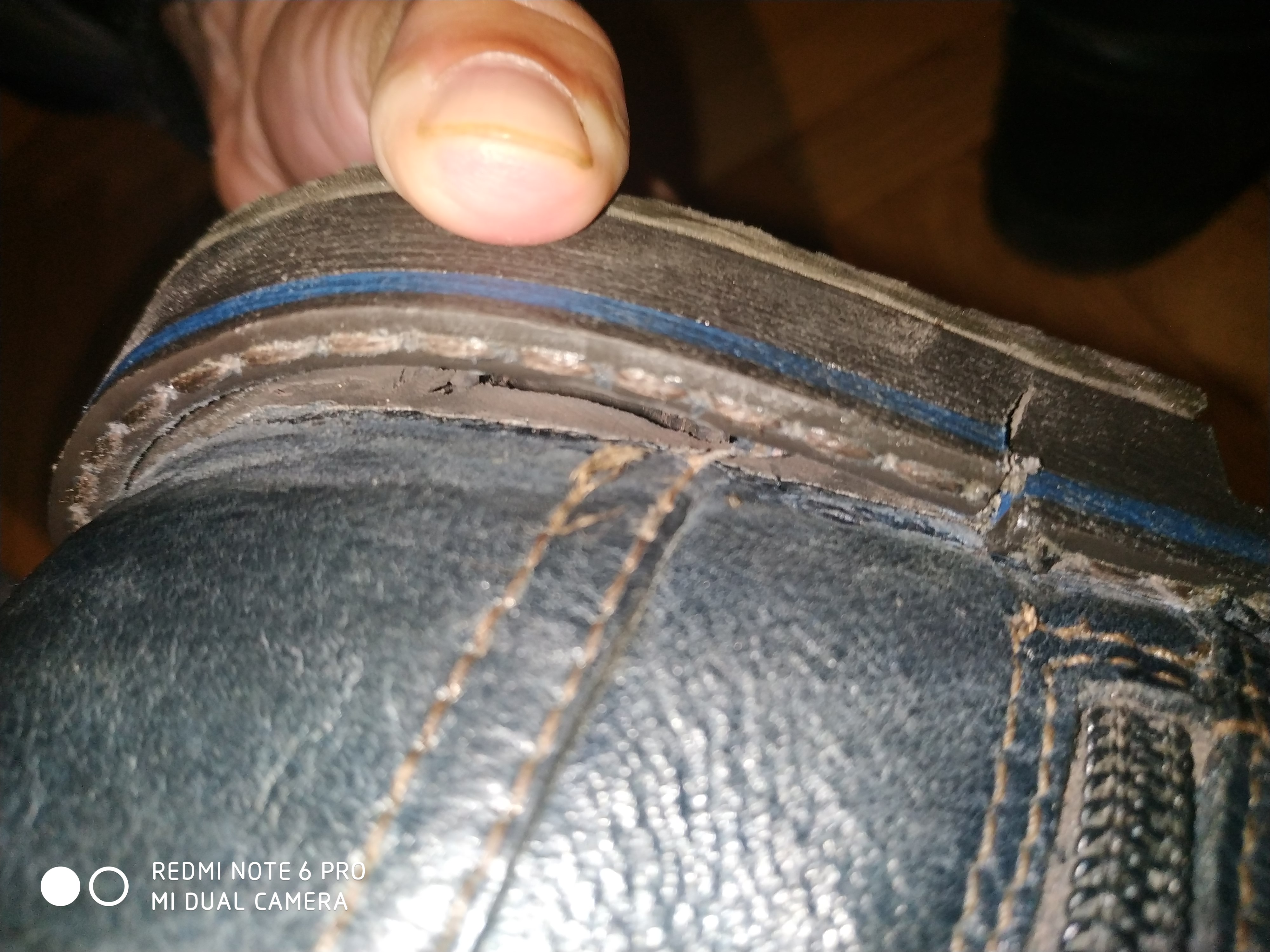 Odklejenie podeszwy obcasa , pęknięcie obcasa w miejscu łączenia taśmy okalającej podeszwę. - but prawy.. W bucie lewym podeszwa przy obcasie również zaczyna się odklejać.