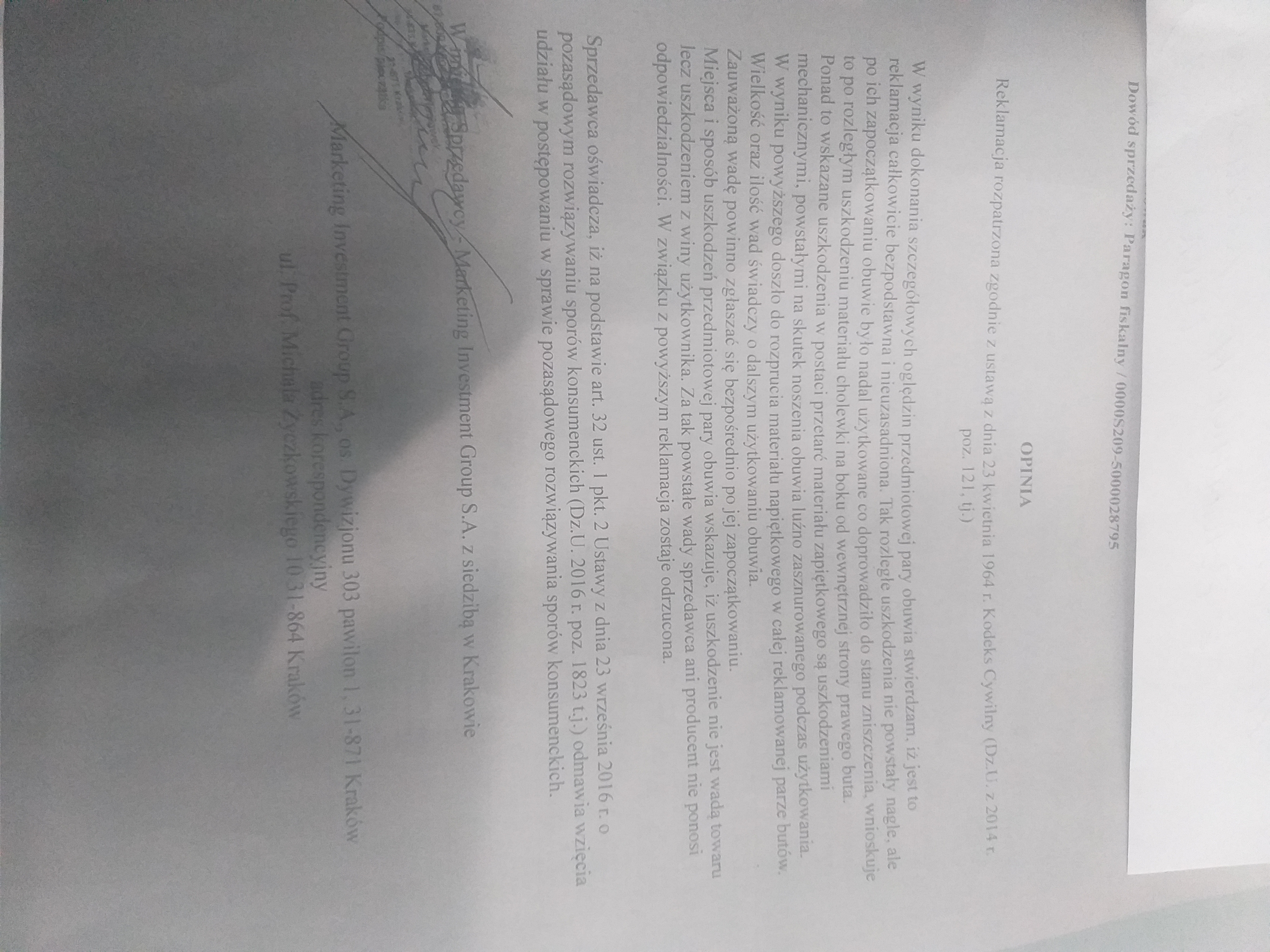 Wymiana towaru na nowy ewentualnie zwrot pieniędzy ,bardzo chamskie podejście doradców sprzedawców. Już w momencie składania reklamacji doradca stwierdził że i tak nie uznana zostanie ta reklamacja.brak słów jeśli chodzi i fachowość, wiedzę i kulture sprzedawców. Stwierdzam po zachowaniu że opinie odrzucającą moja reklamację napisał kierownik lub pracownik salonu.brak opinii rzeczoznawcy,brak przekazania instrukcji użytkowania butów (zarzucono mi że buty były źle uzytkowane,i że są to uszkodzenia mechaniczne za które sklep ani producent nie ponosi odpowiedzialność.zaznaczam że nie ma tam uszkodzeń ani rozerwać np gwoździem co zarzuca mi sprzedawca.dodatkowo zarzuca mi że buty były uzytkowane po stwierdzeniu wady.ze wtedy należy bezzwłocznie to zgłosić.zaznaczam że wada została zauwazona 24.10.21 A zgłoszoną 25.10.21.kolejny blew że strony sprzedawcy.ogolnie zenada