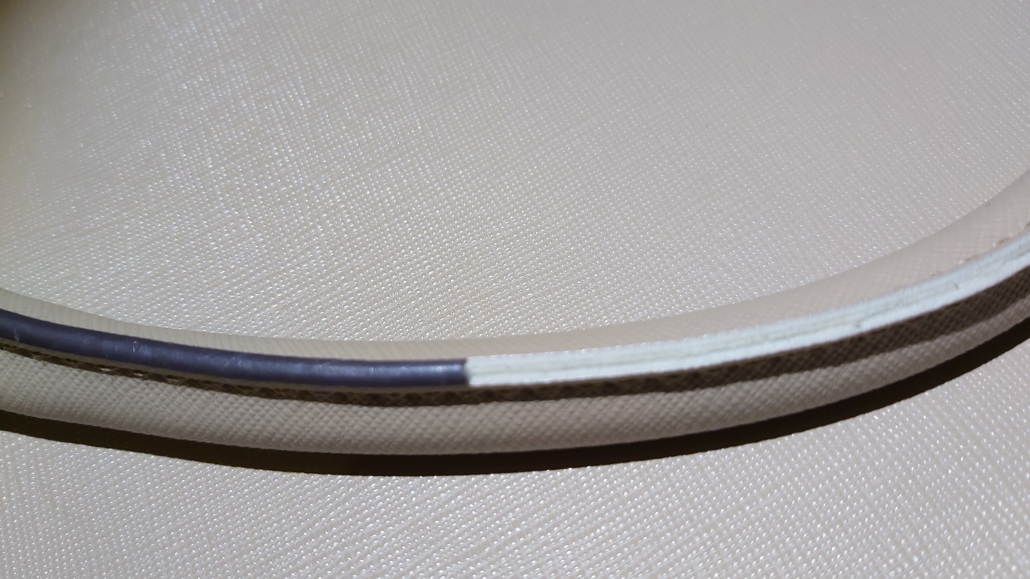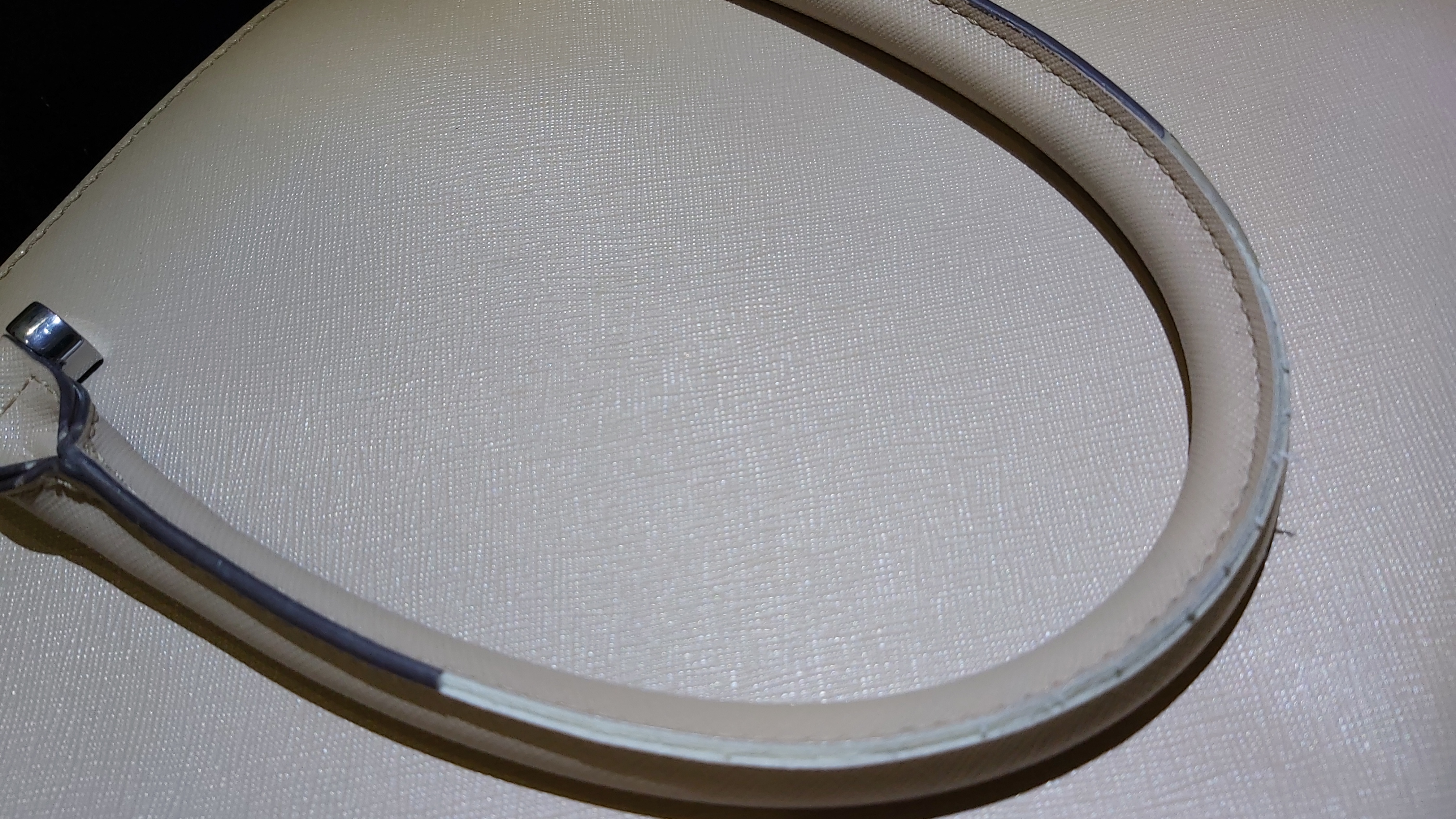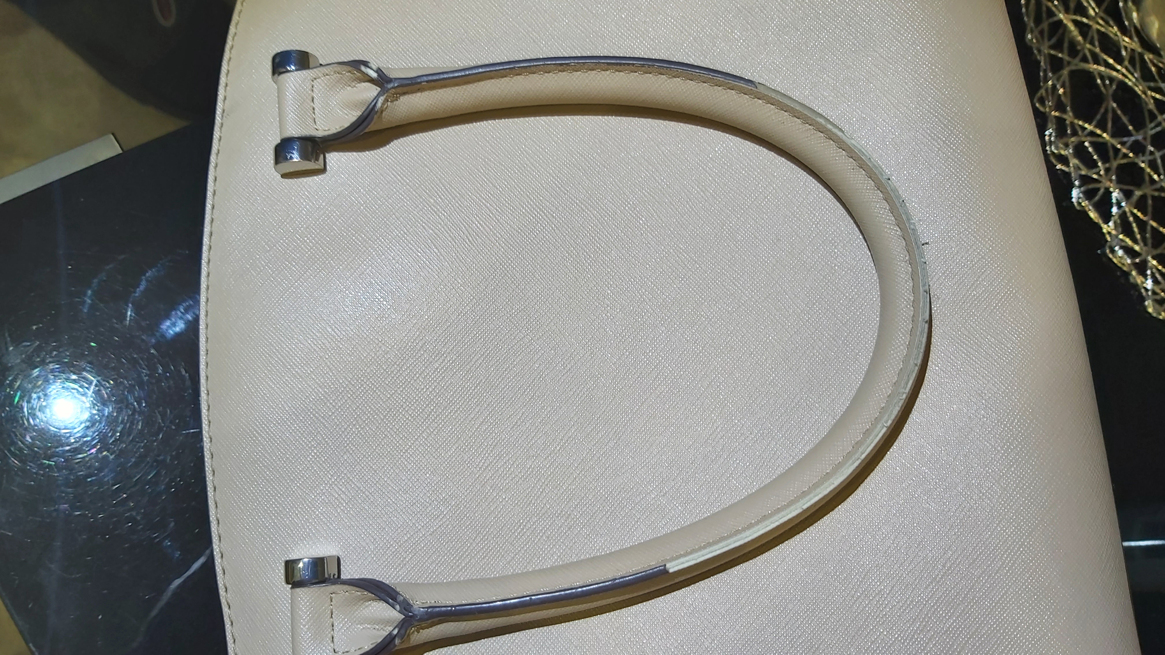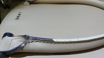 Odklejony lak na niemal całej długości krawędzi brzegowych uchwytów torebki oraz na pasku służącym do zapięcia torebki