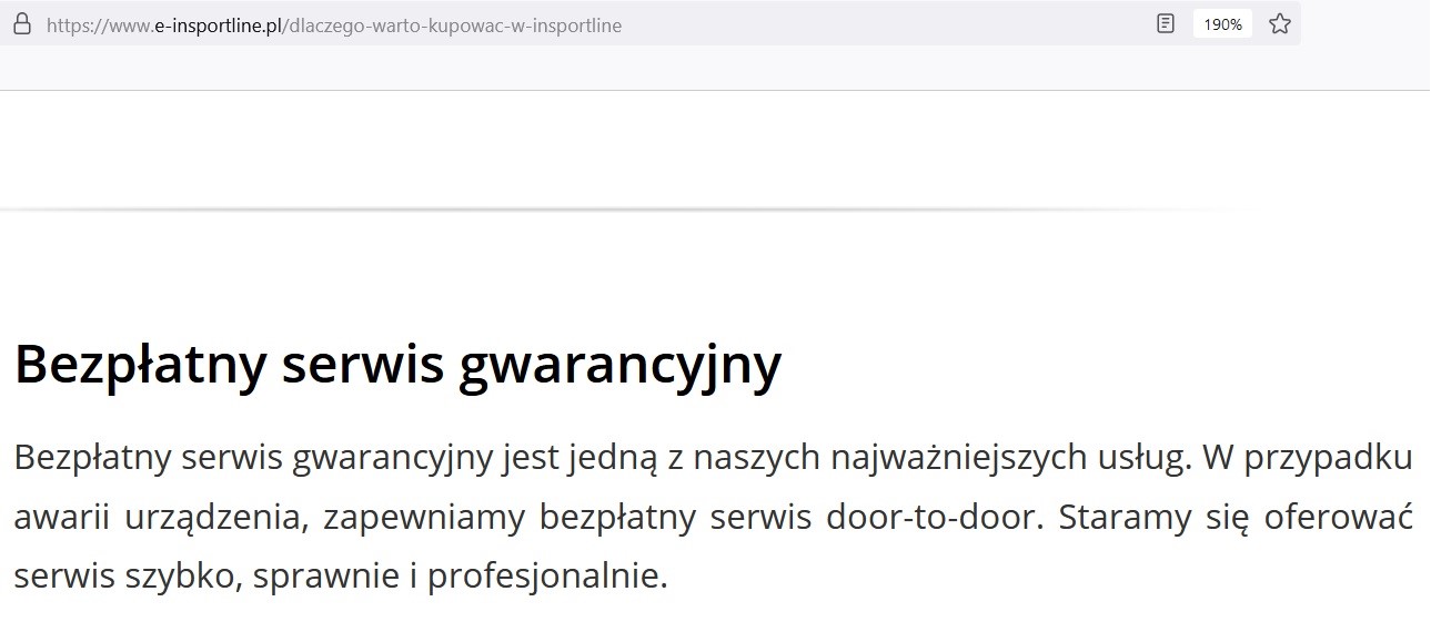 Uzasadnienie serwisu podane w odrzuceniu reklamacji: Zgodnie z oględzinami bieżni, nie stwierdzono wady dlatego zgłoszenia z zarówno z tytułu gwarancji jak i rękojmi nie są zasadne. Dlatego tez kupujący pokrywa koszty transportu oraz usługi serwisowej. Komentarz kupującego: Na otrzymanej fakturze jest wykazana przesyłka kurierska w ilości 2 szt. (łącznie 400 PLN brutto), czyli zostałem obciążony za przesłanie reklamowanego produktu zarówno do serwisu i z serwisu. Wg Kodeksu Cywilnego Art. 561(2) § 1. Kupujący, który wykonuje uprawnienia z tytułu rękojmi, jest obowiązany na koszt sprzedawcy dostarczyć rzecz wadliwą do miejsca oznaczonego w umowie sprzedaży. Również na stronie Insportline jest podana informacja: "BEZPŁATNY SERWIS GWARANCYJNY jest jedną z naszych najważniejszych usług. W przypadku awarii urządzenia, zapewniamy BEZPŁATNY SERWIS DOOR-TO-DOOR. Staramy się oferować serwis szybko, sprawnie i profesjonalnie." W odrzuceniu reklamacji dot. kosztów przesyłki serwis nie podał jaka jest podstawa prawna uzasadniająca, że serwis może obciążyć kupującego kosztami przesyłki reklamowanego produktu zarówno do serwisu i z serwisu.