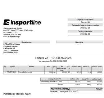 Podsumowanie zgłoszenia reklamacyjnego: Dotyczy zgłoszenia reklamacyjnego numer 7877 z dnia 19.12.2021 z tytułu gwarancji oraz zgłoszenia reklamacyjnego numer 8051 z dnia 19.01.2022 z tytułu rękojmi. Podczas odbioru odesłanego przez serwis produktu, w dniu. 25.01.2022 zostałem obciążony kwotą 400 pln za pobraniem za przesyłkę reklamowanego produktu. Przed odesłaniem do mnie reklamowanego produktu poinformowałem serwis, że ewentualne opłaty za przesyłkę jakie zamierza naliczyć serwis są niezasadne. W Regulaminie sklepu internetowego www.e-insportline.pl nie jest określone, że kupujący ponosi koszty przesyłki dotyczącej reklamowanego towaru.