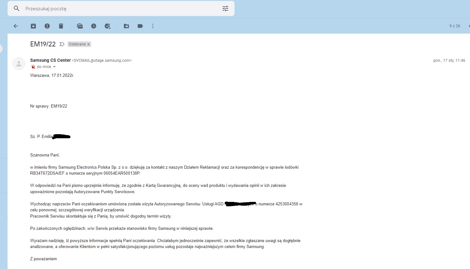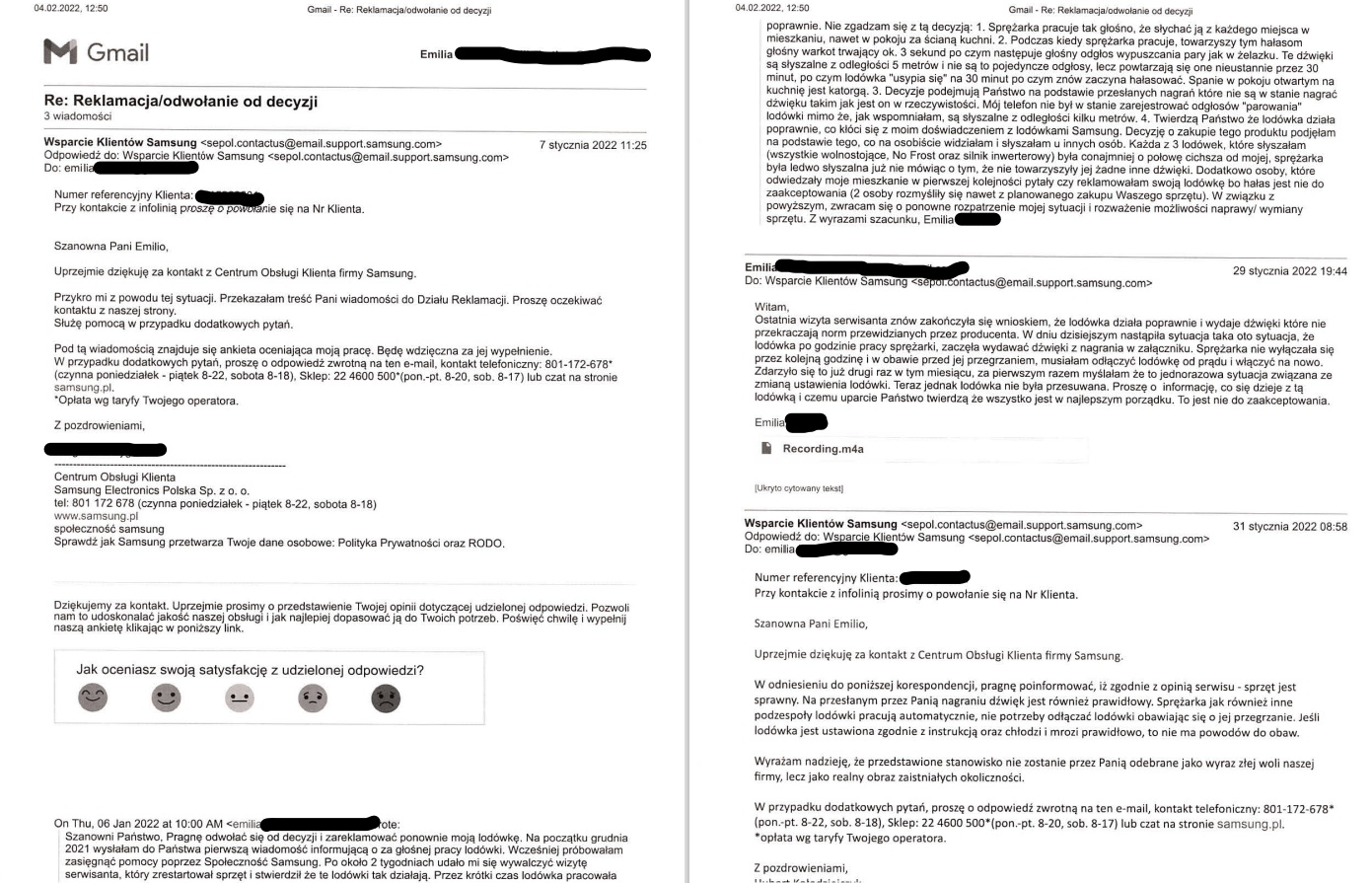 Zgłoszona reklamacja była kolejną jaka została przesłana na przestrzeni dwóch miesięcy od zakupu. Od samego początku zgłaszałam do serwisu problem ze zbyt głośną pracą urządzenia i przesyłałam nagrania. Za każdym razem odpowiedź była taka sama: Lodówka działa poprawnie a odgłosy nie odbiegają od normy.