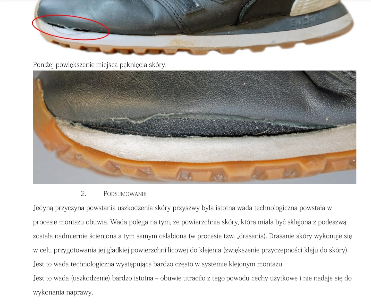Reklamacja nieuznana. Sprawa skierowana do Rzecznika. Pomimo pisma Rzecznika i opinii rzeczoznawcy New Balance Sp. z o. o. nadal nie uznaje reklamacji. Sprawa trafi do sądu.