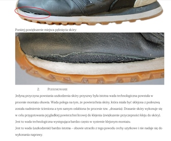 Pęknięcie skóry przyszwy na linii łączenia z podeszwą w lewej półparze.