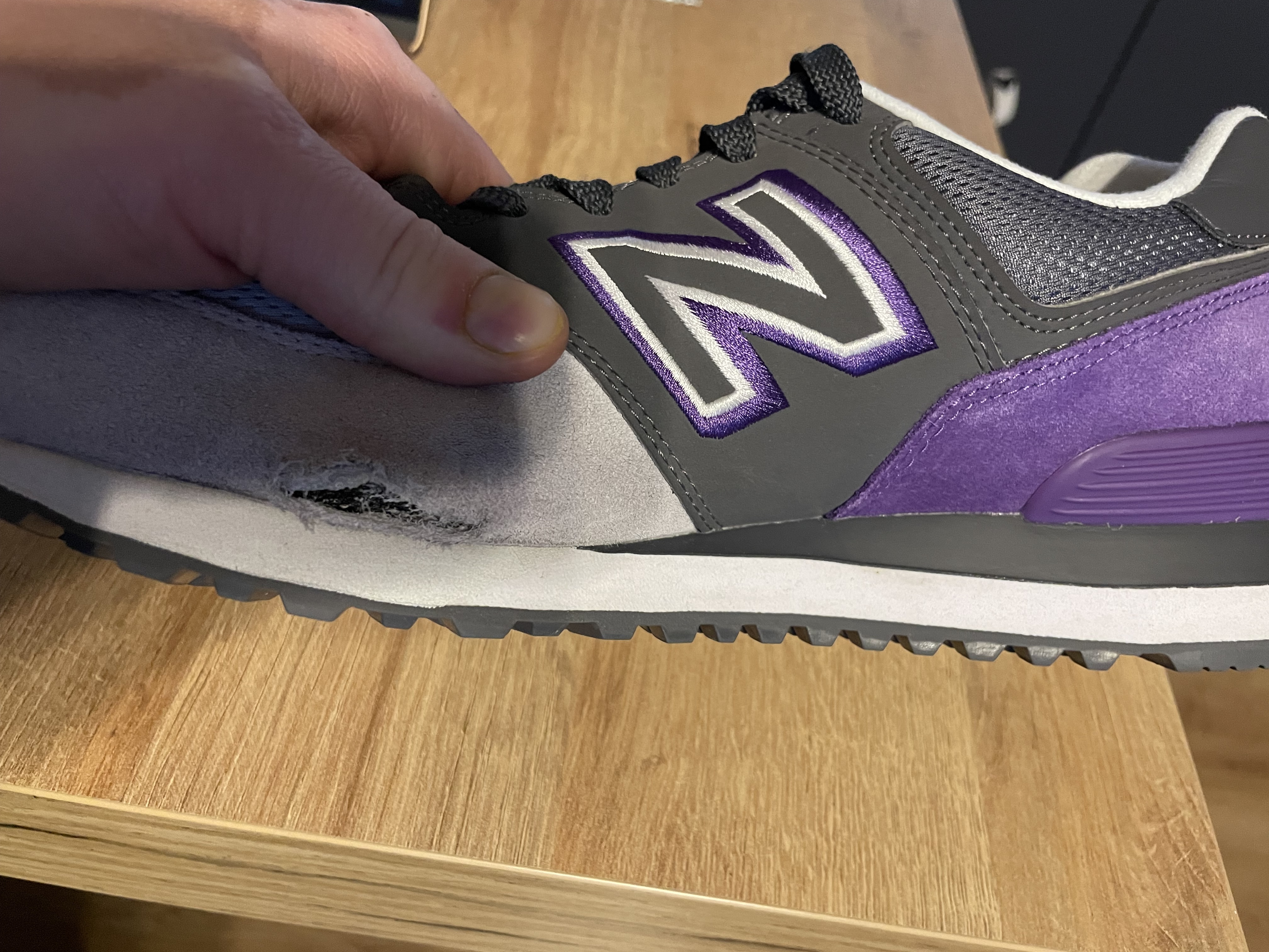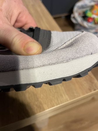 Przetarcia w obydwu butach oraz pęknięcie przy podeszwie w prawym bucie.