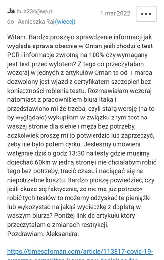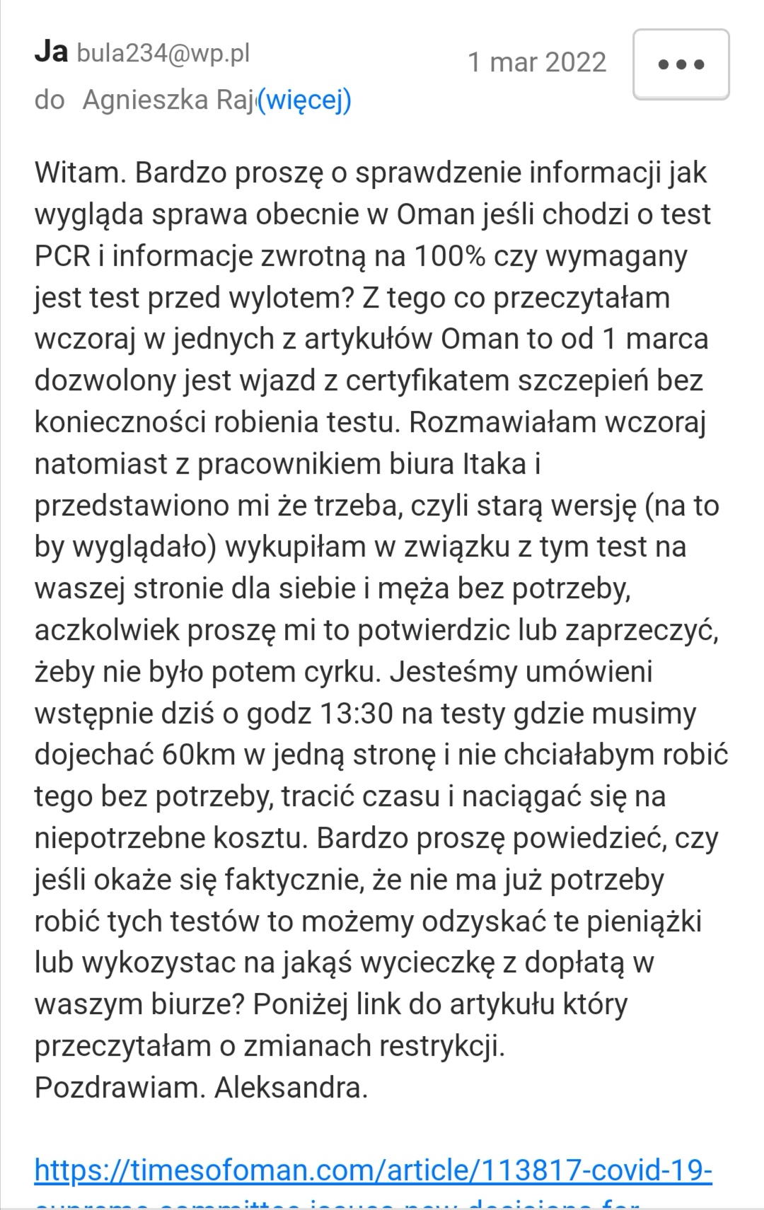 Dzień dobry. Chcielibyśmy złożyć reklamację z powodu wprowadzenia w błąd, iż trzeba wykonywać test przed wylotem do Oman, a od tego dnia było już to zniesione. Pisałam zapytanie do pani, która obsługiwała naszą wycieczkę i pomimo informacji już na stronie Omanskiej, że od 1 marca testy nie są wymagane dla zaszczepionych, (które dołączyłam do korespondencji w e-mailu) dostaliśmy informację zwrotną iż nie ma takich informacji. Testy wykonaliśmy co kosztowało nas to dodatkowe fundusze niepotrzebnie, a w dodatku nie polecieliśmy w tym terminie iż mężowi pomimo zerowych oznak chorobowych wyszedł wynik pozytywny!!!! Nie chce już komentować tego skąd pozytywny wynik u osoby zdrowej??? Nie mniej jednak nie doszło by do tego gdybyśmy otrzymali aktualne informacje. Całe szczęście wycieczka była ubezpieczona i pieniążki nam nie przepadły, ale koszty poniesione które nie podlegały zwrotowi zostały po naszej stronie niestety (498zł testy za 2 osoby zakupione u państwa przez biuro podróży oraz 563zł.za ubezpieczenie). W związku z tym liczę chociaż na zwrot poniesionych kosztów i straty finansowej z tym związanej przez państwa błąd oraz brak aktualnych danych pomimo tego, że dawaliśmy sygnał- nikt tego nie sprawdził. Poniżej przesyłam zdjęcia z rozmowy e-mail oraz zakup imprezy turystycznej oraz testów. Pozdrawiam i liczę na rozwiązanie naszej sprawy na tym etapie.