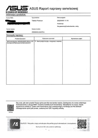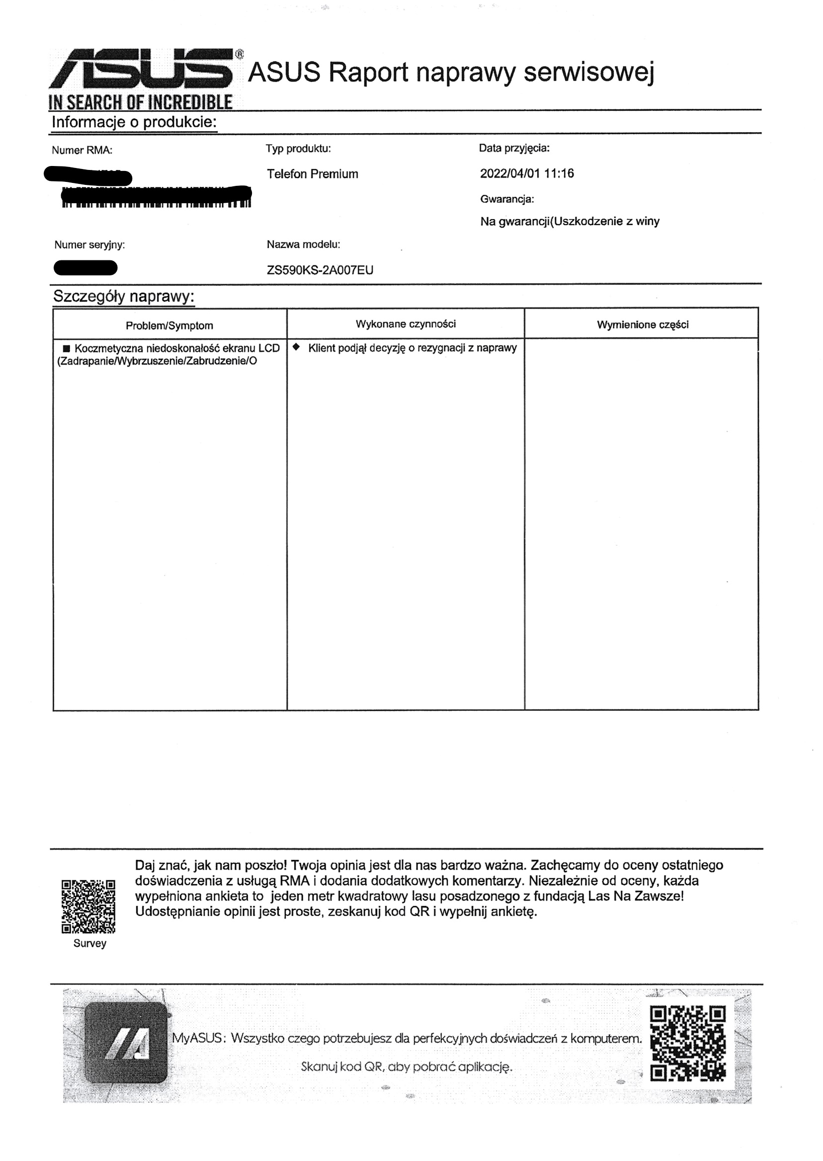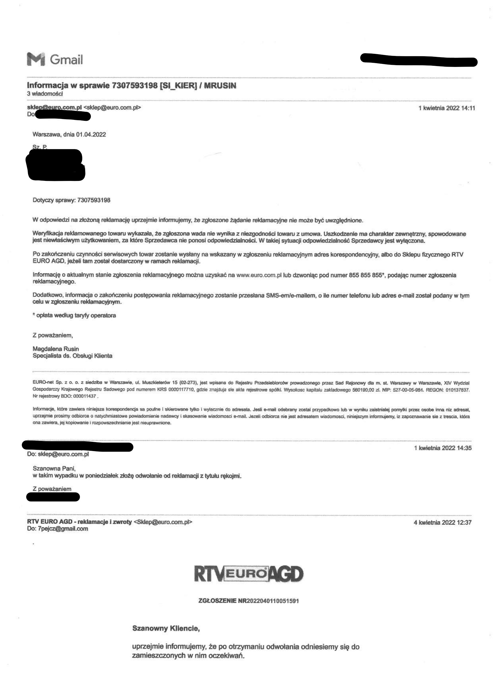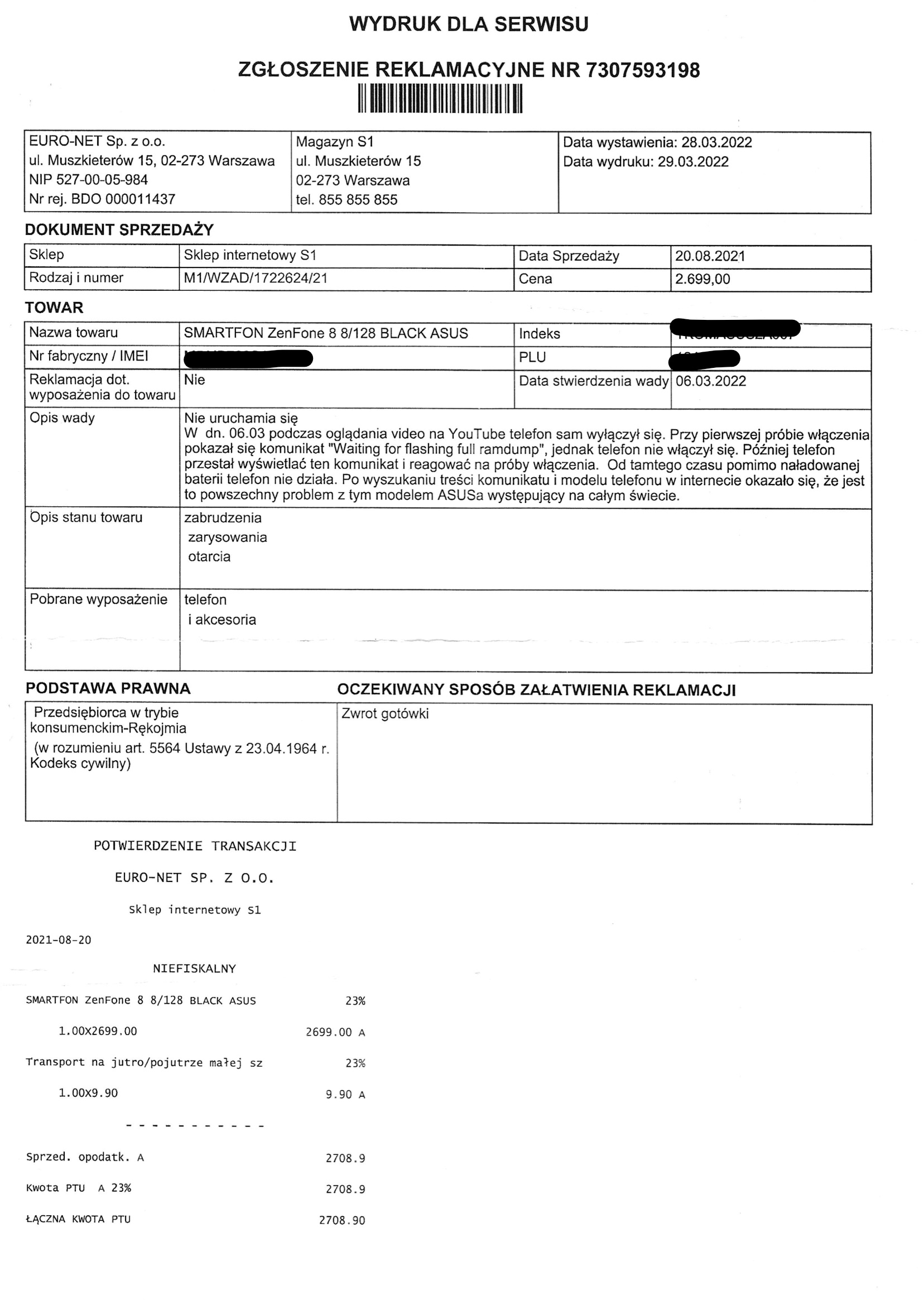 Ponieważ telefon miał uszkodzenie mechaniczne (malutkie pęknięcie w prawym górnym rogu), sklep nie uznał rękojmi. Odwołanie również nie zostało uznane (ba, nawet nie zostało przeczytane). Wg sklepu "w przypadku stwierdzenia jakiegokolwiek uszkodzenia mechanicznego w dostarczonym urządzeniu, odpowiedzialność sprzedawcy zostaje wyłączona.", co jest wbrew przepisom, co zresztą zostało opisane w odwołaniu... Sprawa idzie dalej do Rzecznika Praw Konsumenta, a następnie do sądu. WSTYD.