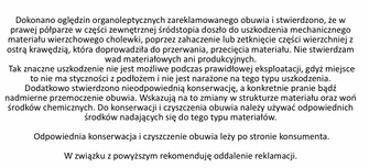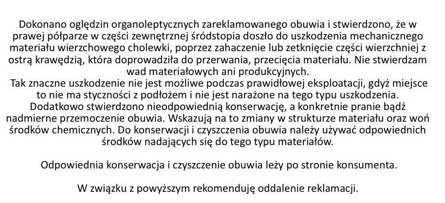Podstawą odrzucenia reklamacji był wyimaginowany fakt, iż uszkodzienie powstałe w bucie wynikło na skutek prania obuwia (stwierdzone na podstawie zapachu), rozcięcia ostrym narzędziem (buty uszkodzone są mocno od środka a dziura wewnątrz ma nieregularny kształt) prawdopodobnie materiał był stary i zleżały albo nieodpowiedni
