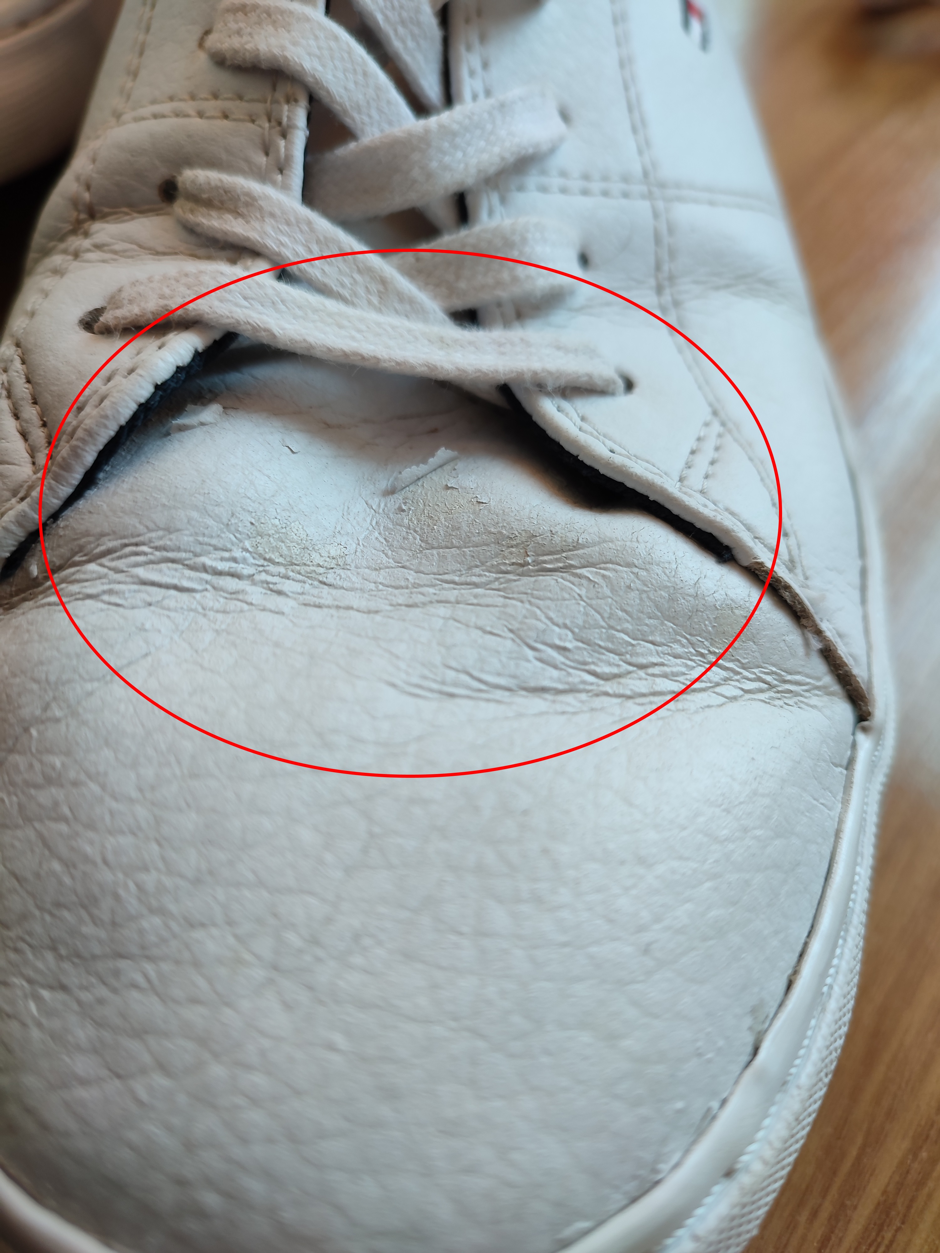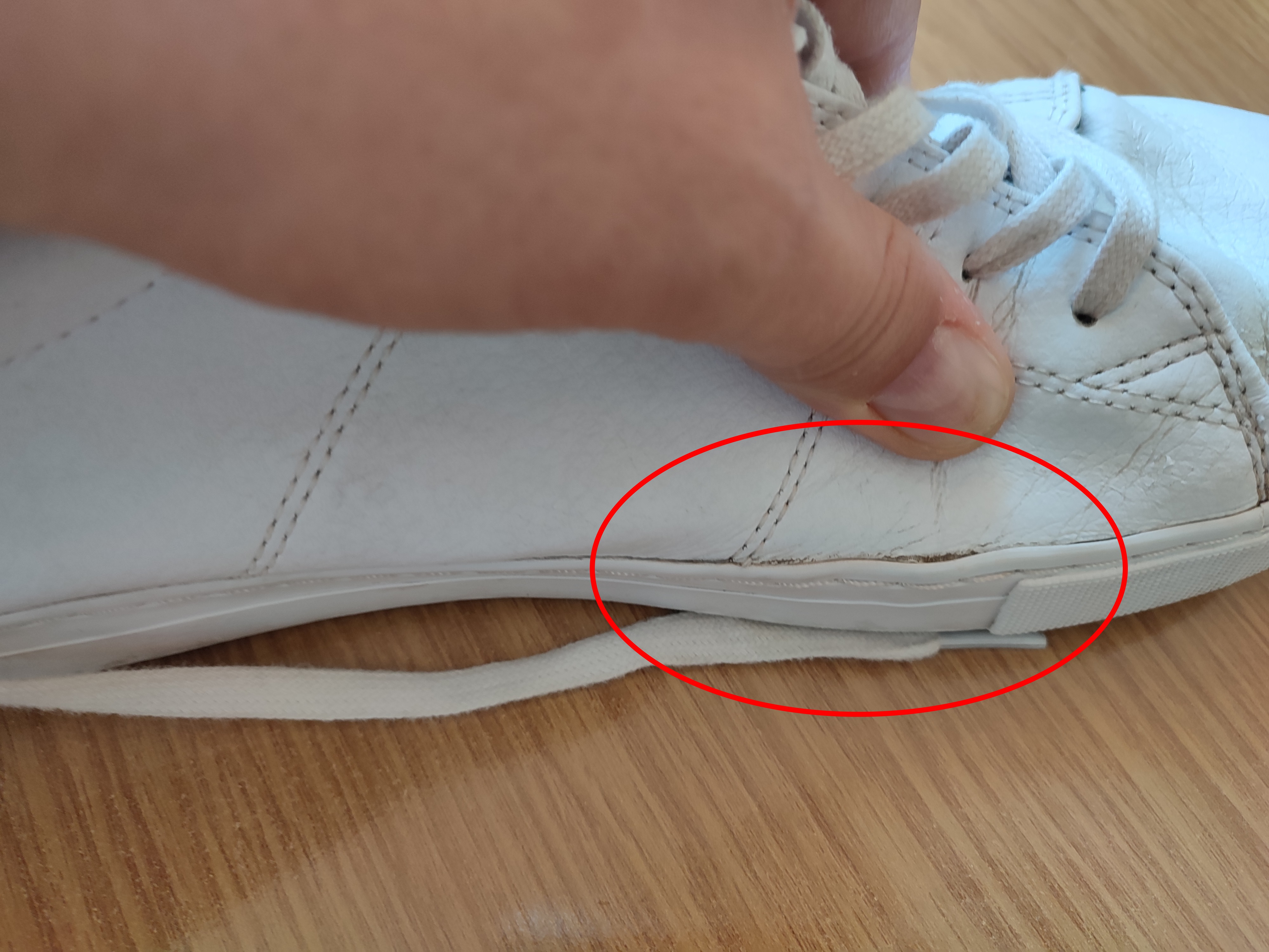 Rozdarcia obu butów od wewnątrz przy łączeniu z podeszwą. Oraz łuszczenie się skóry na wysokości palców.