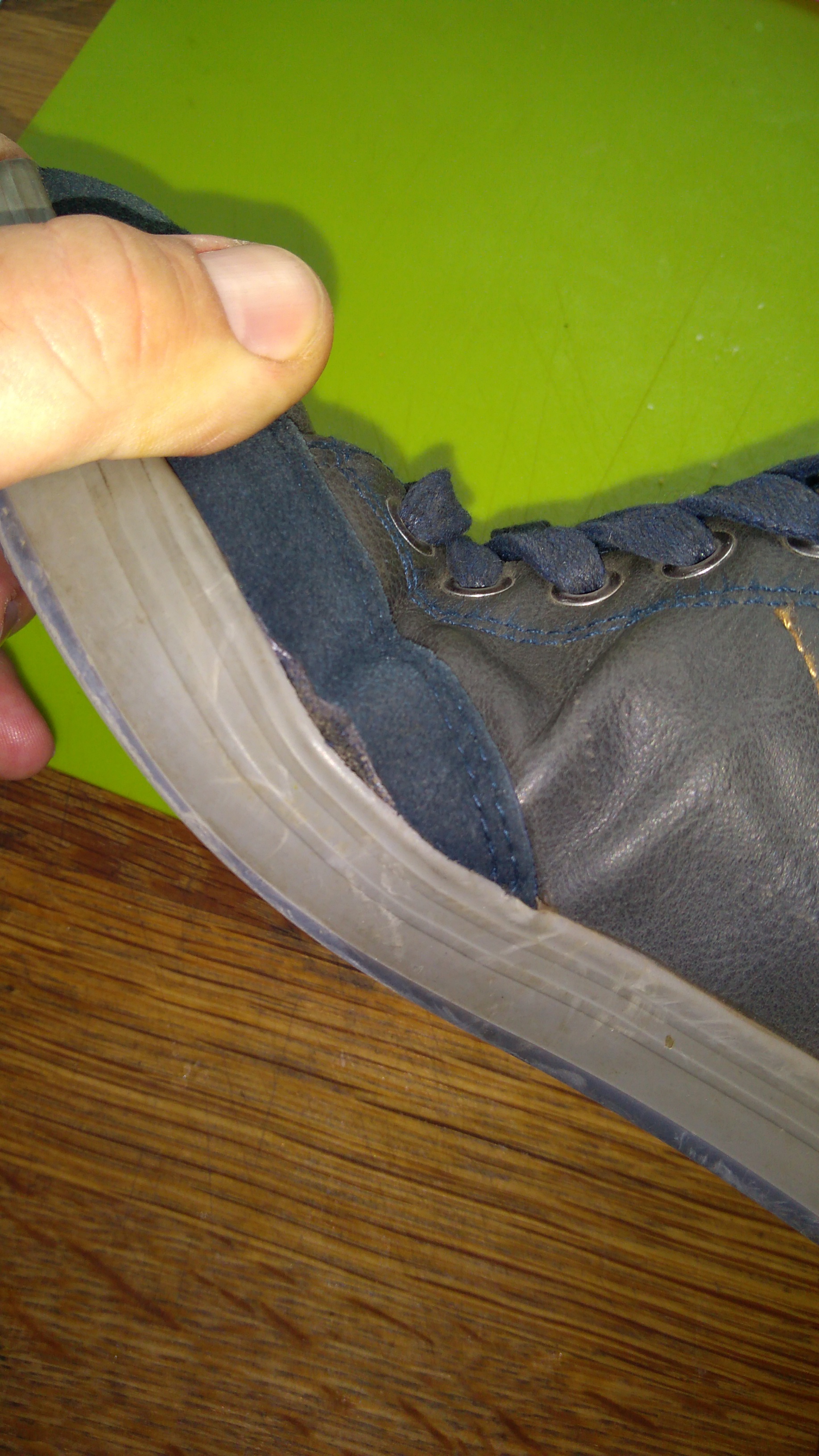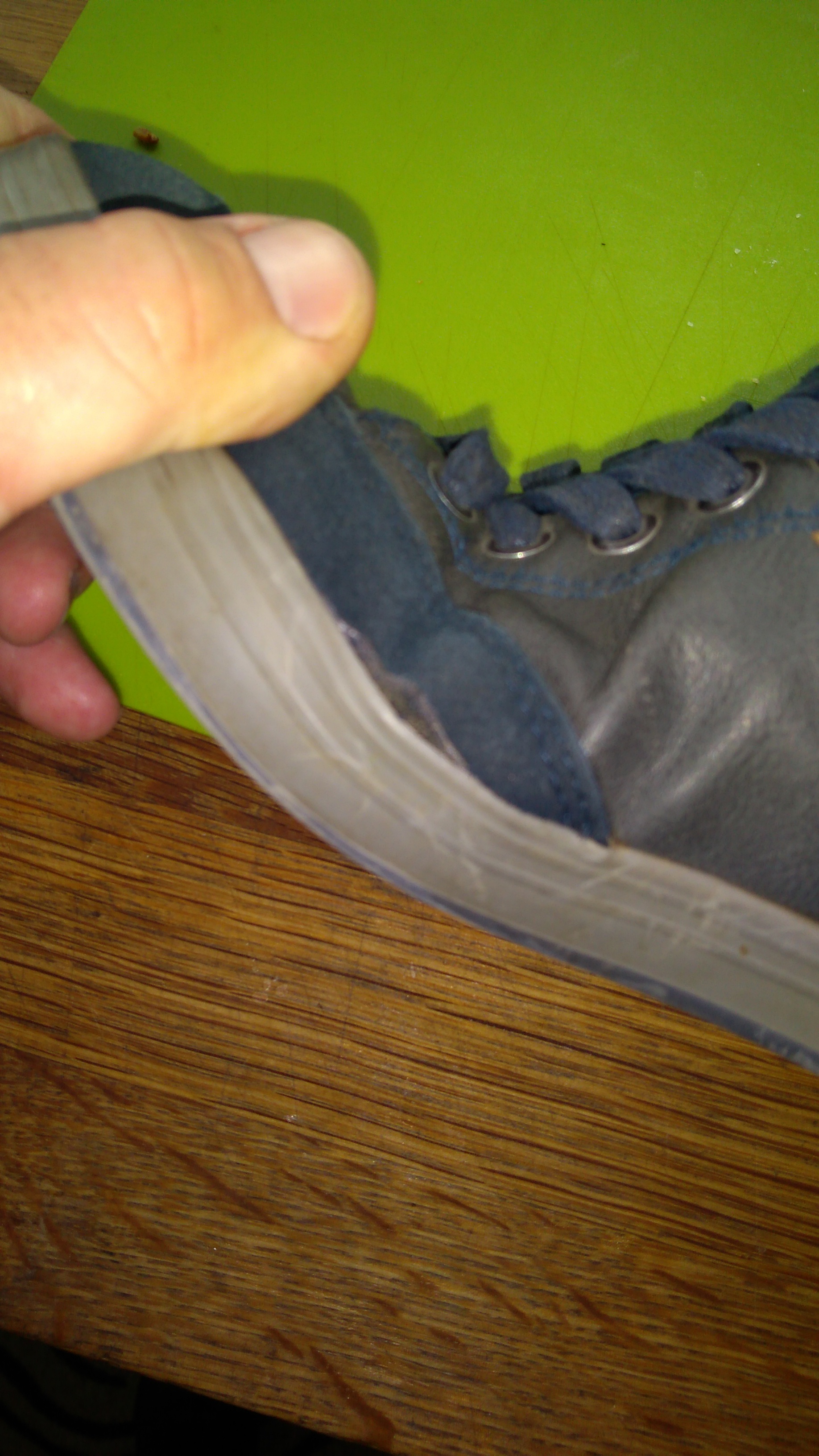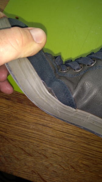 Pęknięcie materiału w miejscu zginania stopy.