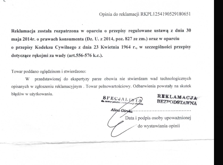 Zakupiłam tenisówki koloru blado niebieskiego,Gdy wysiadałam z samochodu zaczął padać deszcz Następnego dnia zobaczyłam przebarwienia przy sznurówkach w kolorze różowym. Reklamowałam buty i reklamacja została odrzucona ( opinia rzeczoznawcy - odbarwienia powstały przez błędy w użytkowaniu) czyli jednym słowem trzeba nosić przy sobie obuwie zastępcze na wypadek zmiany pogody .