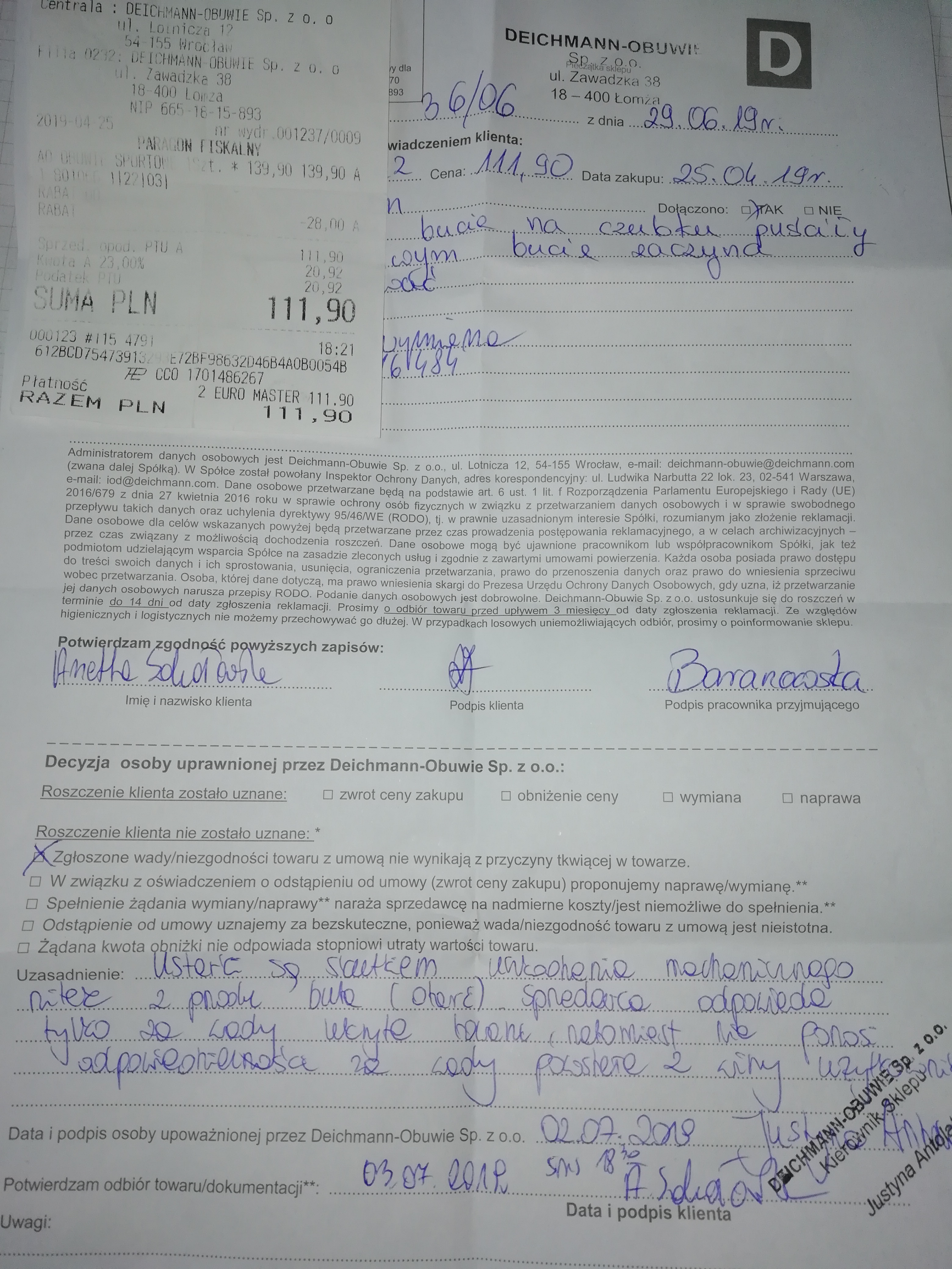 Pani w sklepie powiedziala, że producent nie daje gwarancji na buty, poniewaz sa kupowane poza granicami kraju, a tu ewidentnie dziecko przetarlo nitki. Zwróciłam Pani uwagę, że na noskach butów brak otarcia i były założone nie więcej niż 10 razy na nogi.