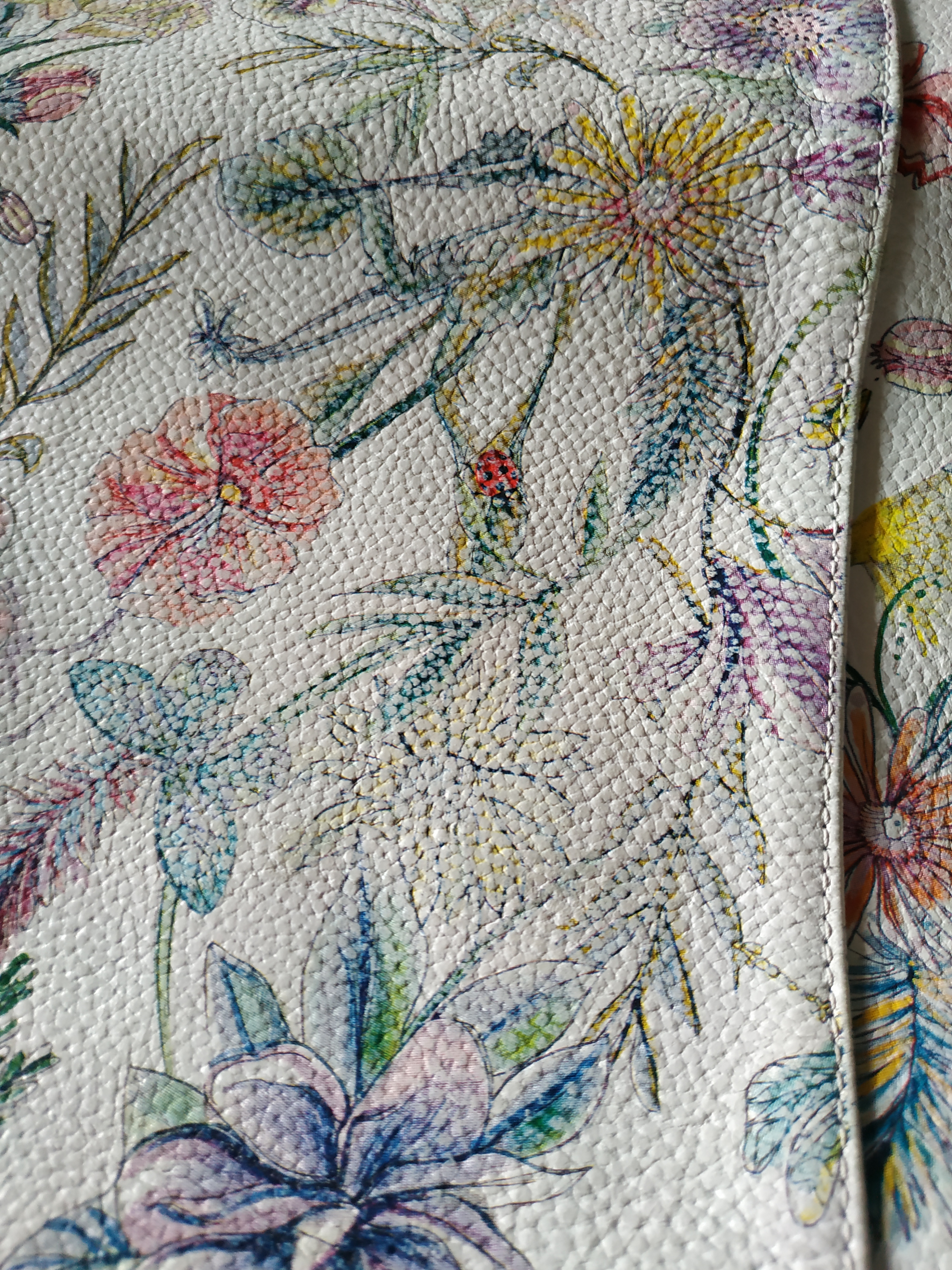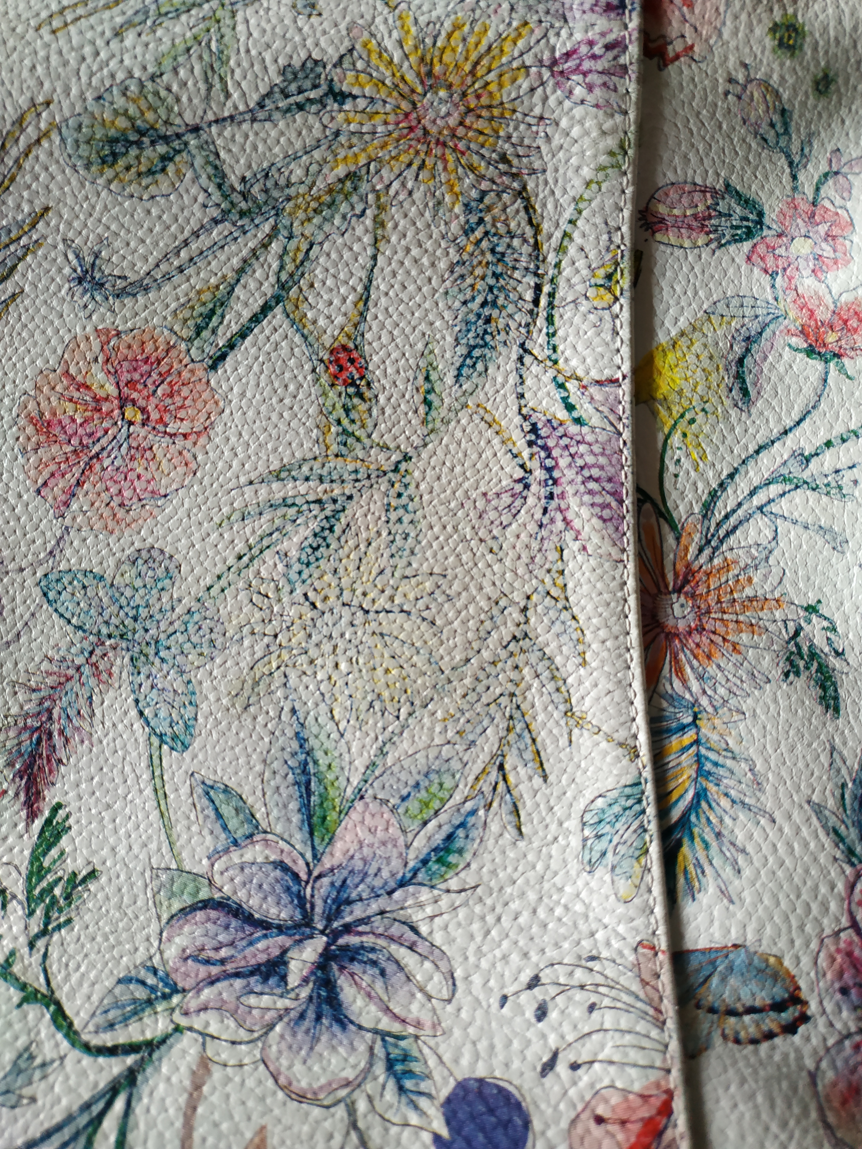 Na skórze namalowano kolorowe kwiaty i farba mocno wytarła się z nich ...