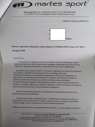 20.08.2019 wysłałam odwołanie dotyczące odrzucenia reklamacji. Uzasadnienie odrzucenia reklamacji przez Martes Sport jest niespójne, wykazuje brak zapoznania się z przedmiotem reklamacji oraz powołuje się na nietrafione argumenty, których sprzedawca nie może udowodnić.