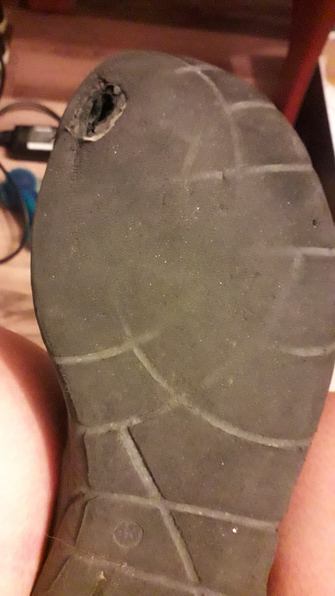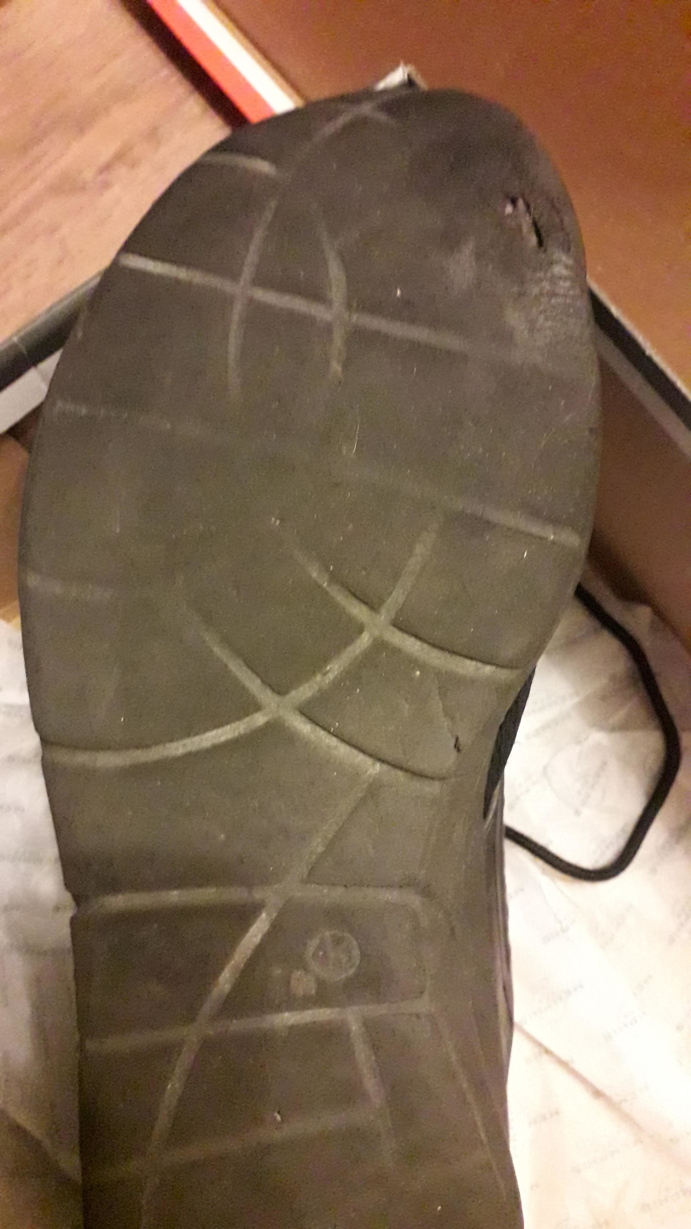 Przetarcie podeszwy w prawym bucie natomiast w lewym bucie jest dziura