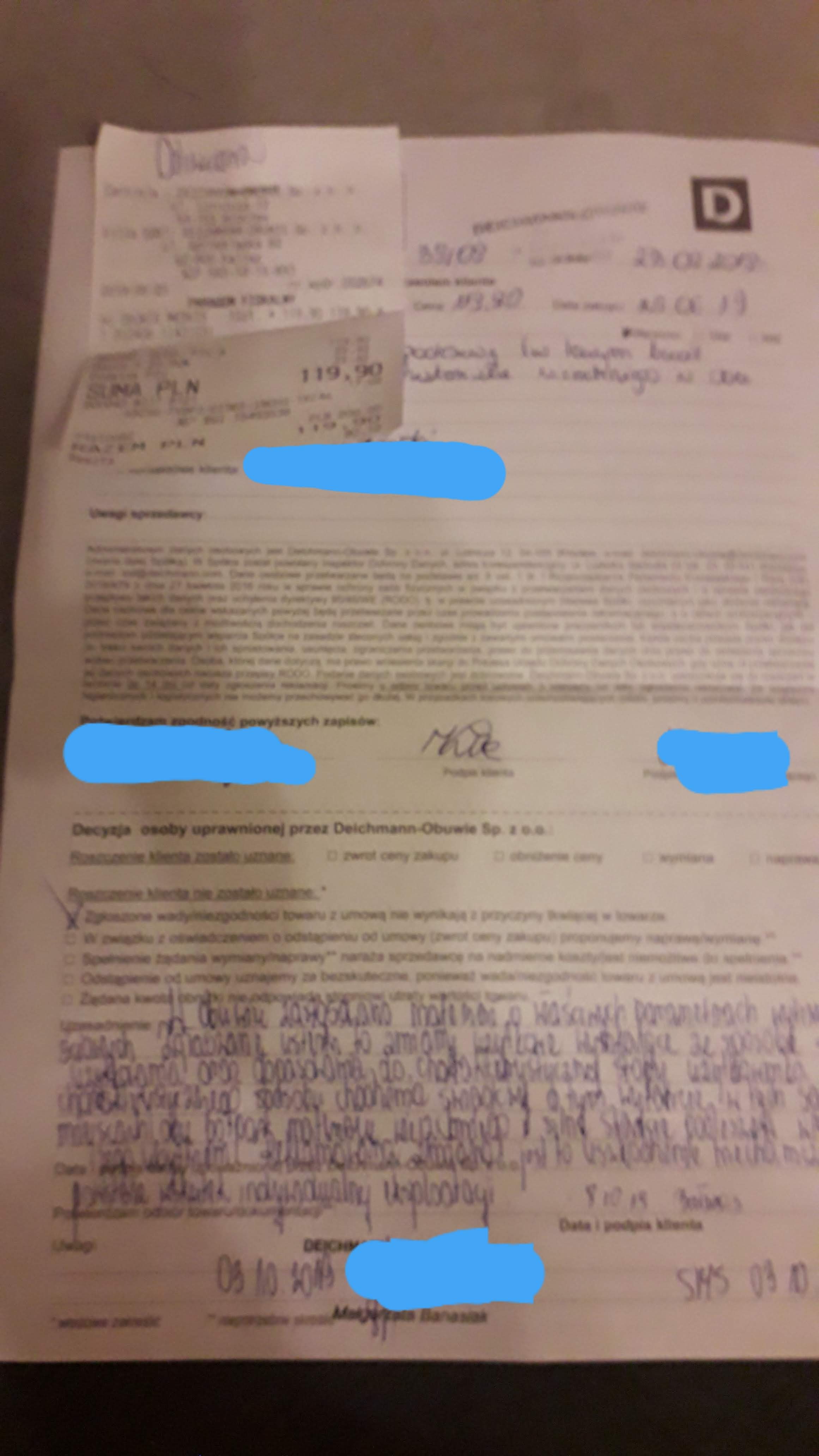 Powód, jaki podano nie uznając reklamacji jest kuriozalny otóż według Pani kierownik sklepu wada powstała ze sposobu użytkowania oraz dopasowania do charakterystycznej stopy użytkownika i charakterystycznego sposobu chodzenia. Buty po trzech miesiącach użytkowania zakupione w cenie 119,90