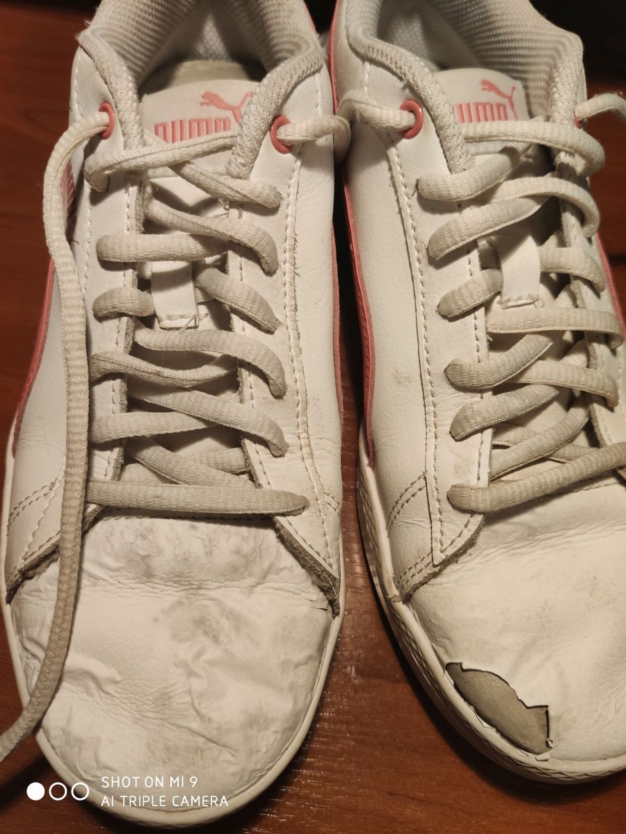 Deformacja (pęcherze) z przodu prawego buta i pęknięty materiał lewego buta.