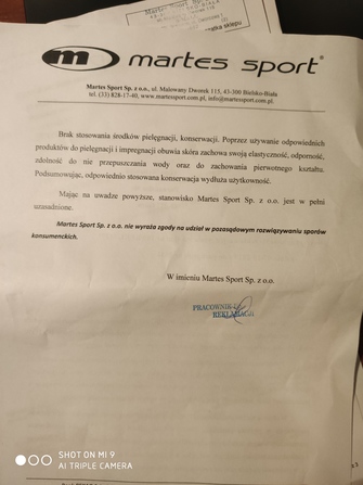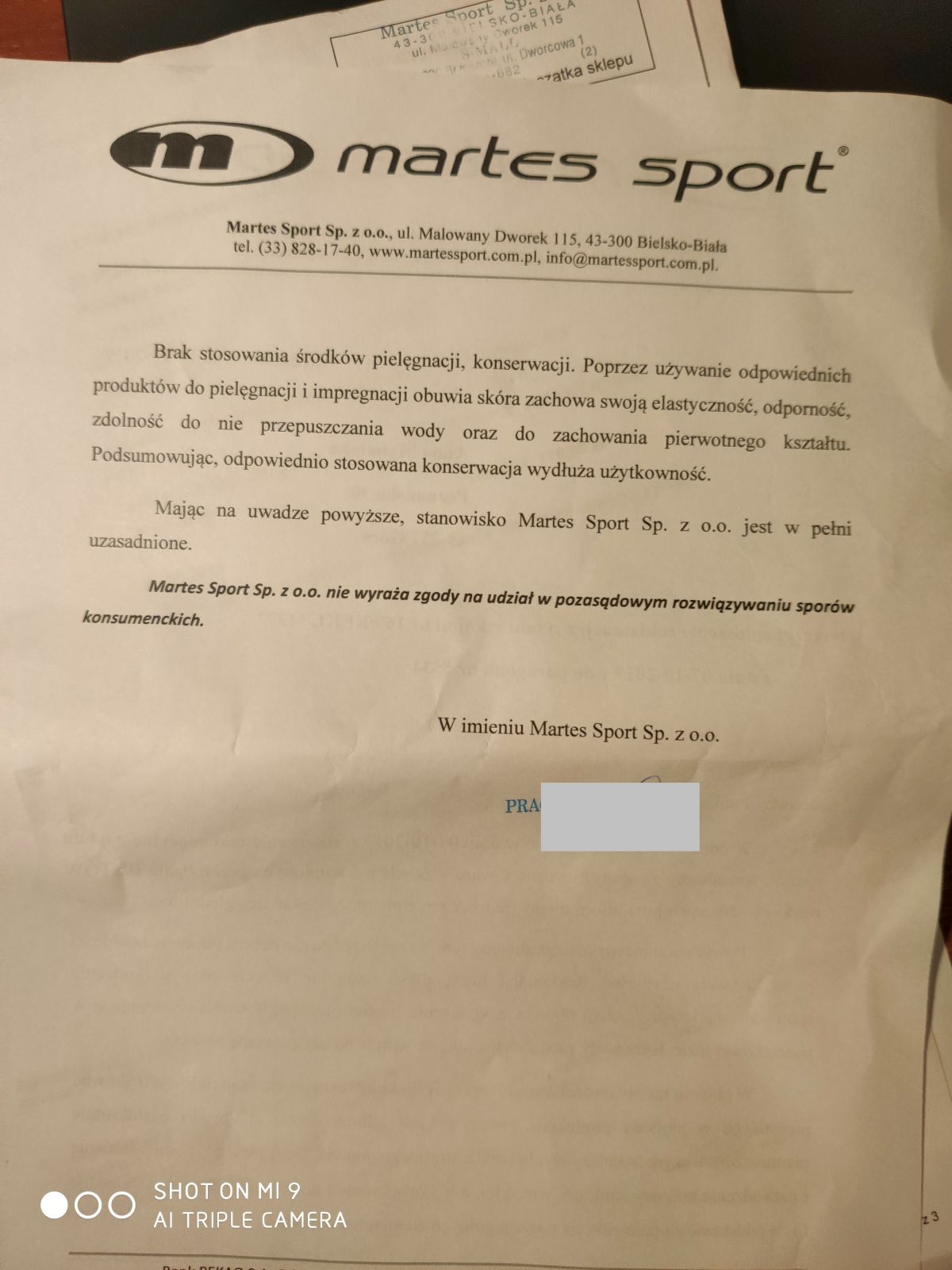 Zepsuta część butów nie jest wykonana ze skóry. Zarzucono mi brak impregnacji obuwia, a na paragonie, oprócz w/w obuwia widnieje pozycja: impregnat, który polecono mi zakupić razem z butami. Ten wlaśnie impregnat stosowałam.